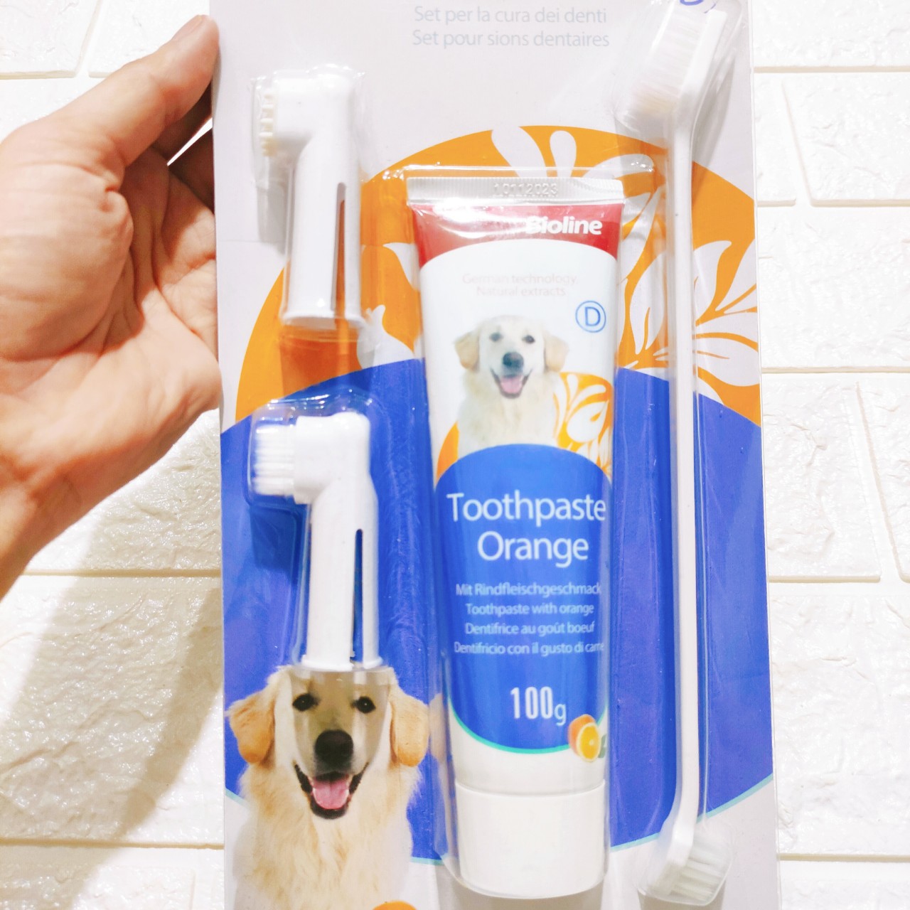 Bộ Kem đánh răng cho chó Bioline 100g + Bàn chải gồm: - 1 tuýt kem đánh răng 100g - 1 bàn chải răng 2 đầu - 2 ngón tay cọ răng ƯU ĐIỂM: -