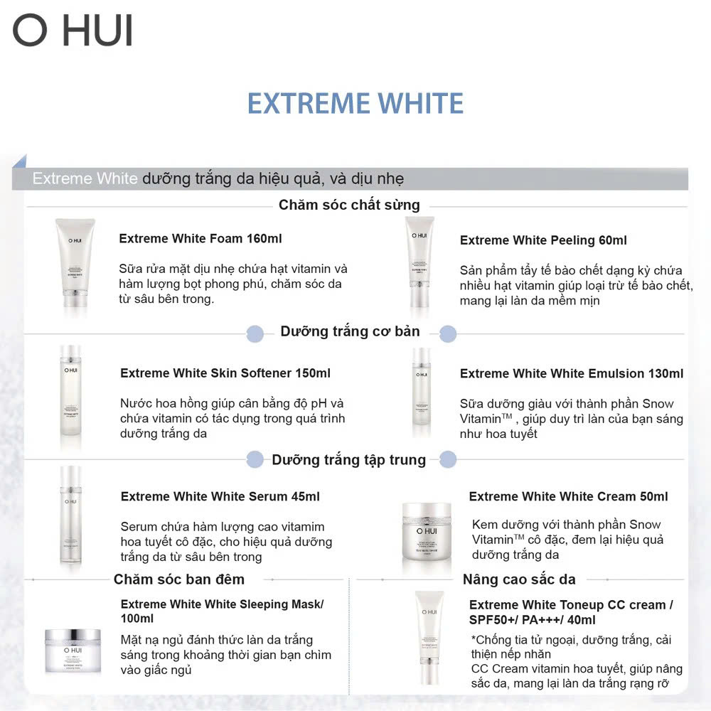 Công dụng : – Sự kết hợp tinh tế giữa 2 thành phần chủ đạo trong cả bộ sản phẩm Ohui Extreme White. Chiết suất cô đặc của Snow Vitamin cung cấp hàm lượng lớn