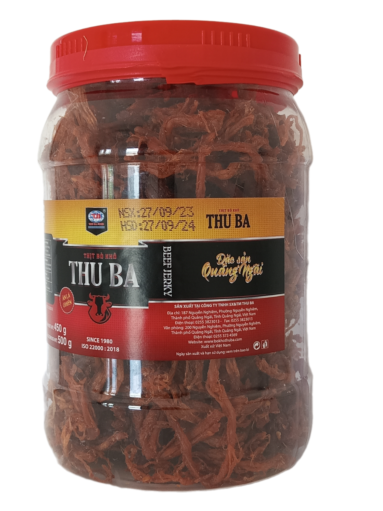 BÒ KHÔ THU BA là món đặc sản Quảng Ngãi, đạt tiêu chuẩn ISO 22000 và là Hàng Việt Nam Chất Lượng Cao do Người tiêu dùng bình chọn từ 2017 đến 2024 Sản phẩm được sản