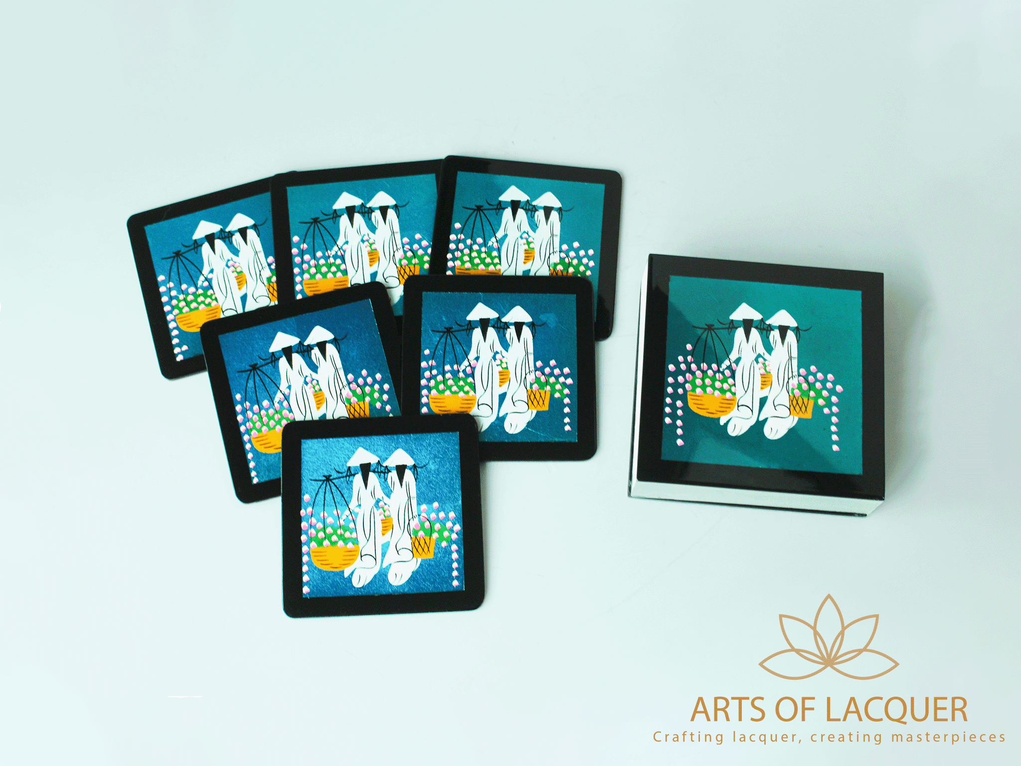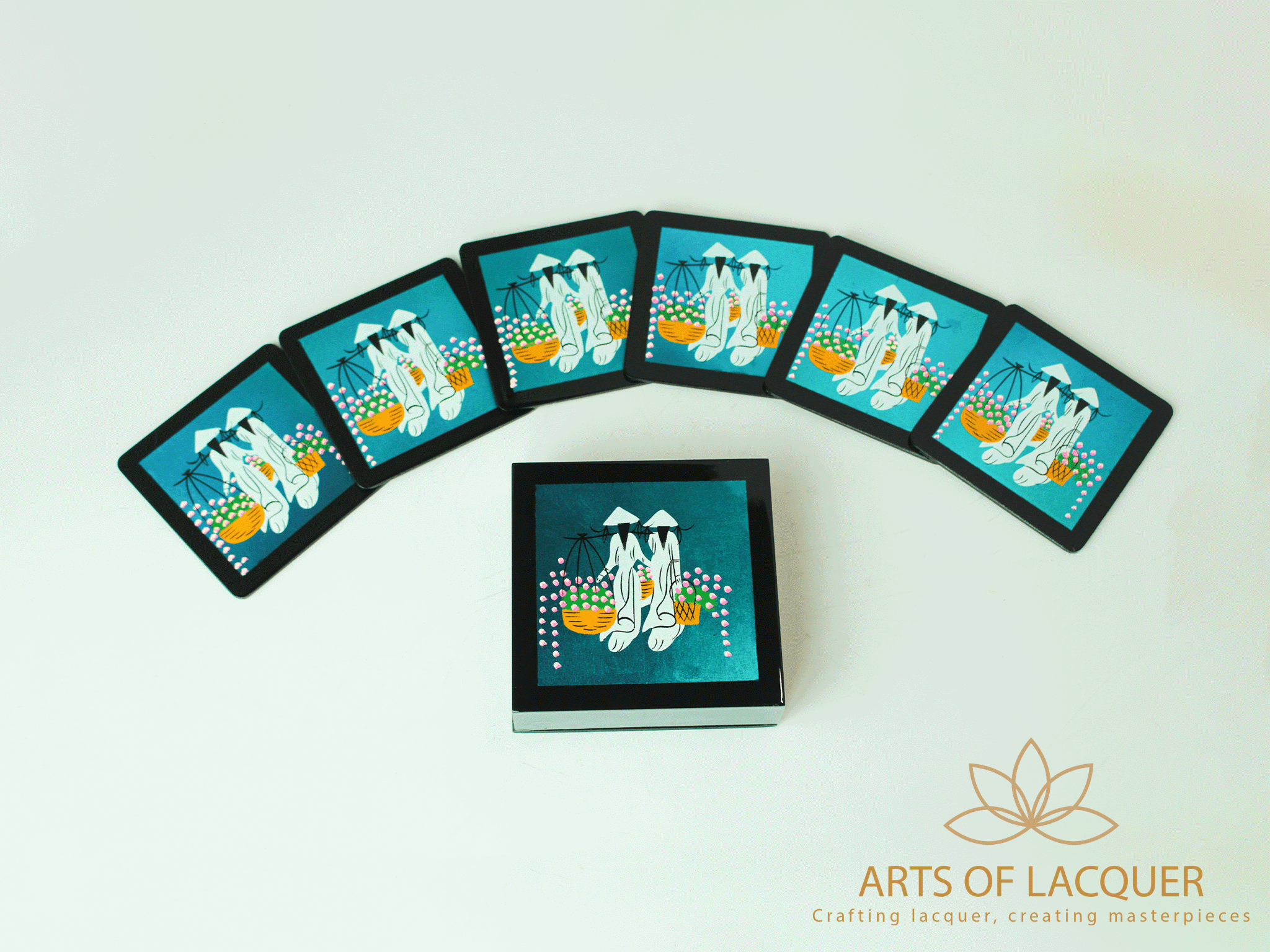 Đây là một bộ sáu chiếc đế lót ly được thiết kế vô cùng tinh xảo và độc đáo. Mỗi chiếc lót ly có hình vuông, được đặt trong một khung màu đen mạnh mẽ tạo nên sự tương phản rõ rệt với hình ảnh trung tâm. Nền của hình ảnh trên lót ly là màu xanh dương nhẹ nhàng, tạo cảm giác thanh bình và dễ chịu. Hình ảnh nổi bật trên nền xanh là hai người phụ nữ mặc trang phục áo dài truyền thống Việt Nam và đội trên đầu chiếc nón lá. Trên vai họ là những gánh hoa chứa những bông hoa màu sắc tươi sáng mang đậm bản sắc văn hóa Việt.