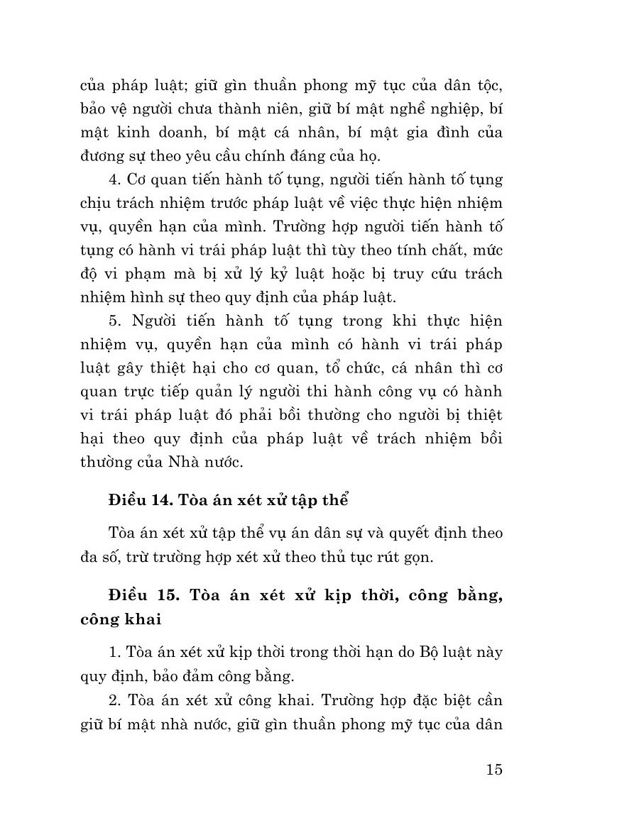 Mua tại TiktokCuốn sách là văn bản nhất thể hóa của Bộ luật Tố tụng Dân sự năm 2015 với nội dung sửa đổi, bổ sung Bộ luật Tố tụng Dân sự năm 2015 của Bộ luật Lao động năm 2019 và Luật Doanh nghiệp năm 2020; gồm 10 phần, 42 chương, 517 điều, quy định những nguyên tắc cơ bản trong tố tụng dân sự; trình tự và thủ tục để khởi kiện, yêu cầu để Tòa án giải quyết tranh chấp dân sự, hôn nhân và gia đình, kinh doanh, thương mại, lao động…, cung cấp cho bạn đọc một văn bản Bộ luật Tố tụng dân sự hoàn chỉnh, thuận tiện trong tra cứu và áp dụng Bộ luật.