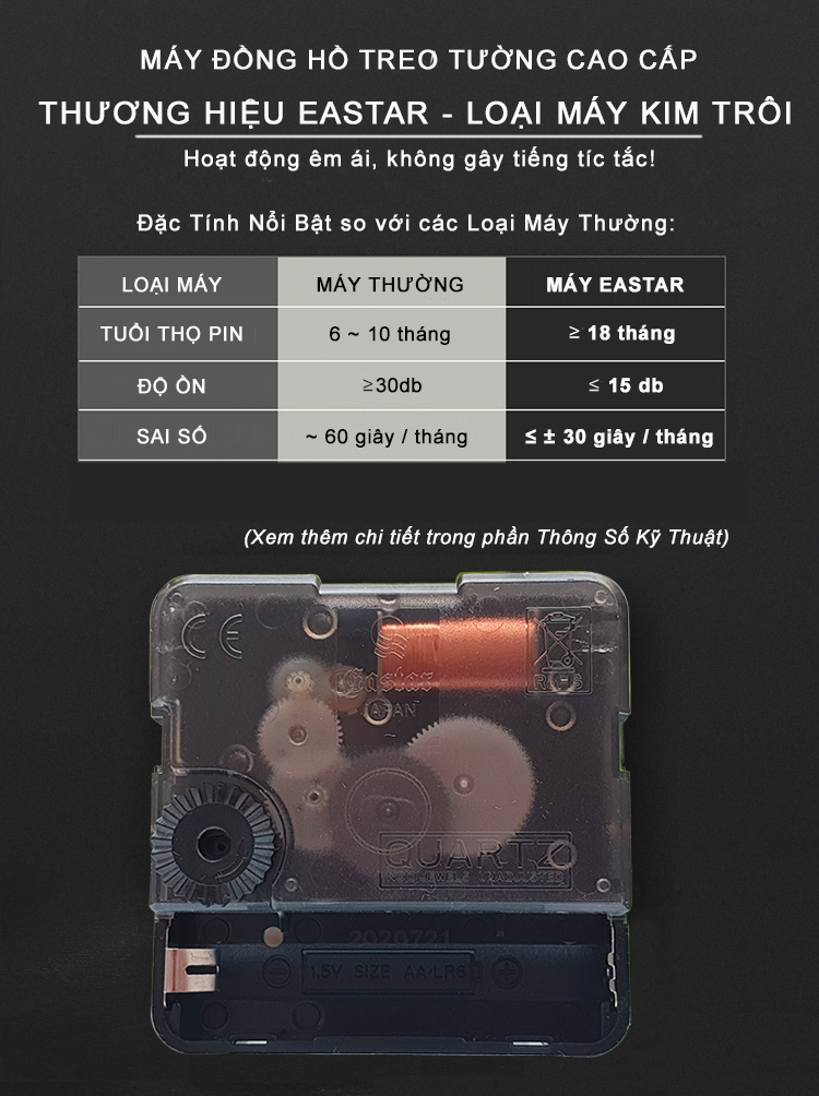 1. THÔNG TIN CHI TIẾT: - Thương hiệu: Eastar. - Loại: Máy Đồng hồ Treo tường Kim dạ quang Công nghệ Thạch anh (Quartz) chạy kim (Analogue), Loại máy đồng hồ kim trôi chạy êm