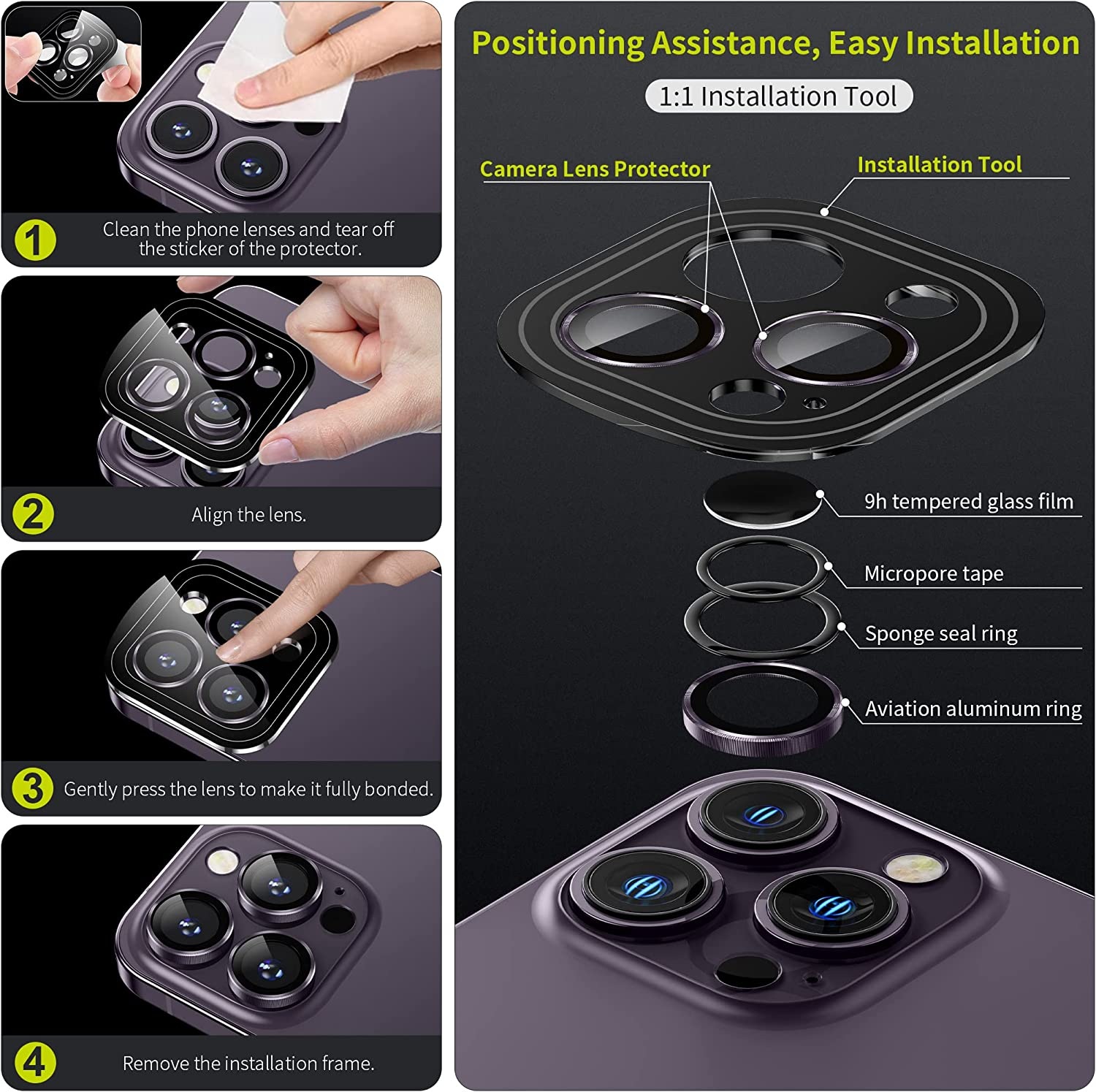 Bộ miếng dán kính cường lực bảo vệ Camera cho iPhone 14 Pro / 14 Pro Max hiệu HOTCASE URR mang lại khả năng chụp hình sắc nét full HD (độ cứng 9H, tặng kèm khung tự dán)