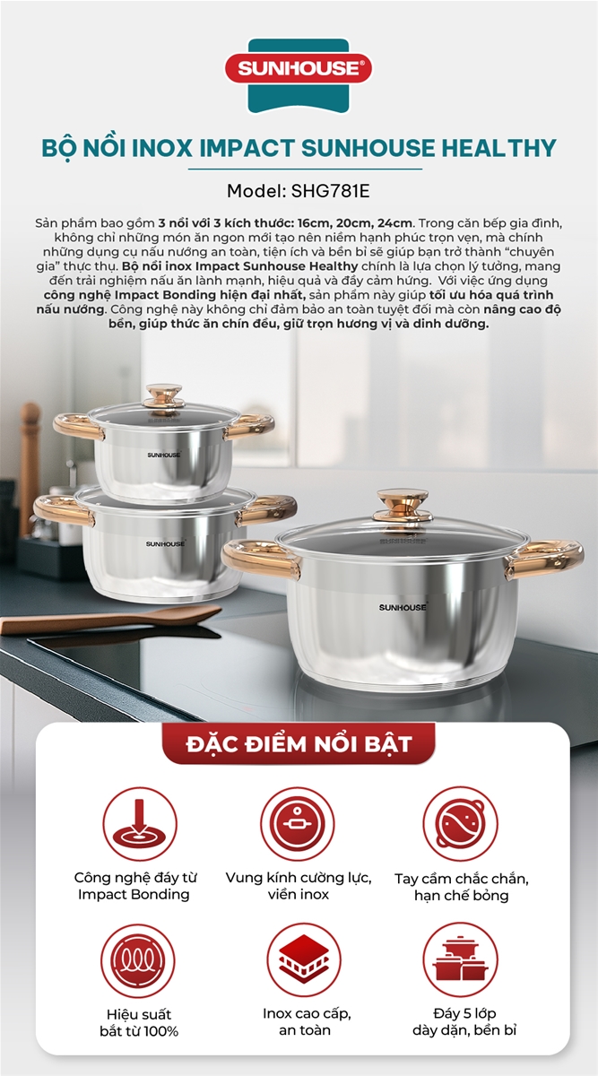 ✨Bộ nồi inox Impact Sunhouse Healthy SHG781E -Gồm 3 nồi 16-20-24cm - Đáy phẳng hoàn hảo - Hiệu suất bắt từ 98%