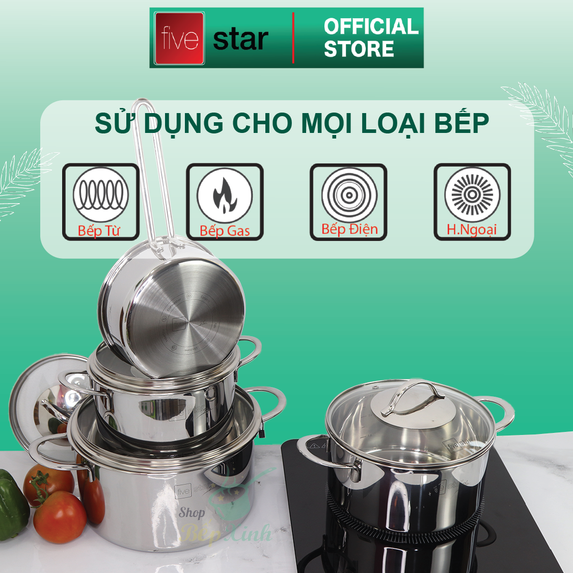 Bộ nồi xửng cao cấp Fivestar 4 món 3 đáy từ , nắp kính ( tặng 1 sạn inox ) Bộ nồi gồm : 1 nồi 16cm , 1 nồi 20cm , 1 nồi 24cm