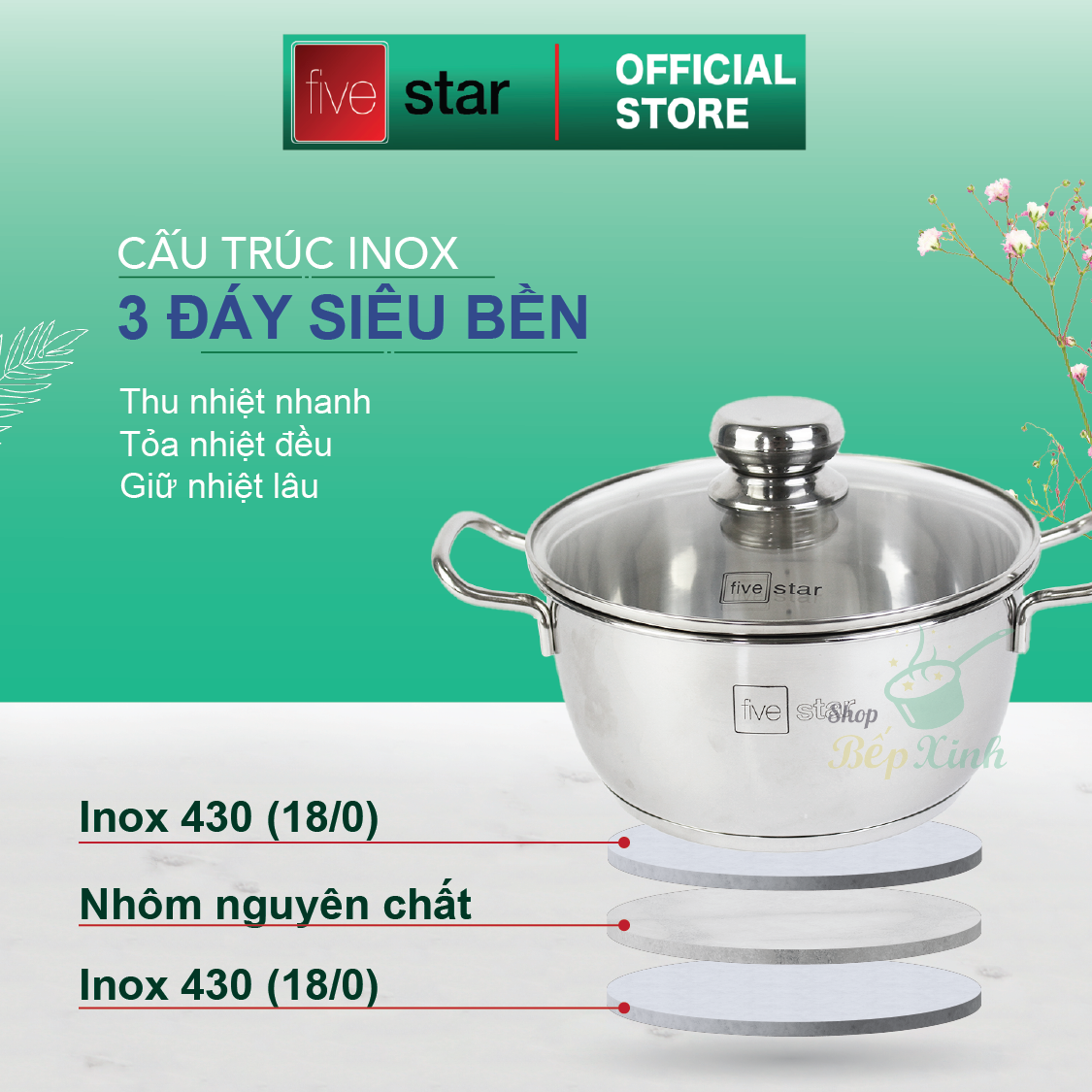 Bộ nồi chảo xửng hấp 3 Đáy Inox 430 cao cấp Fivestar Standard bếp từ nắp kính , tặng 1 vá canh Bộ nồi inox có 9 món gồm : +Quánh có đường kính