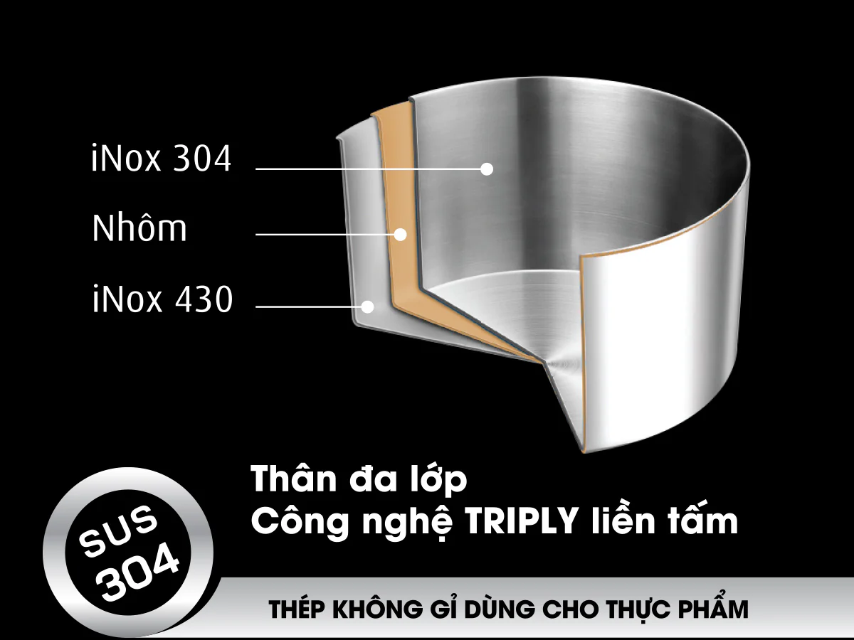 Thân Triply 3 lớp (inox 304 – nhôm – inox 430), dày 2.5 mm, truyền nhiệt nhanh, giữ nhiệt tốt.