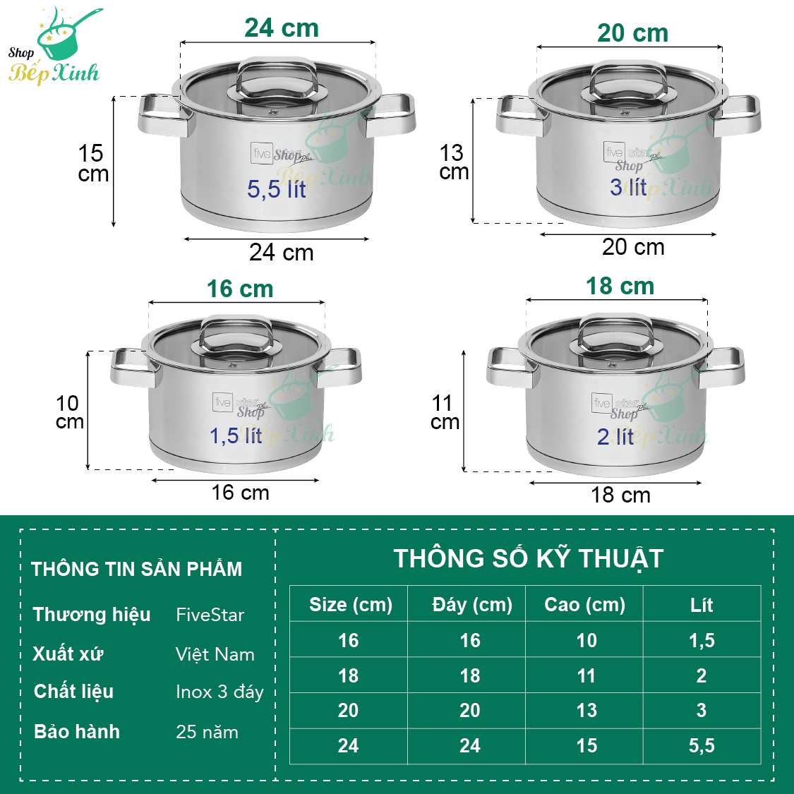 ✨Bộ Nồi Inox 304 Cao Cấp Fivestar 3 Đáy Từ 4 Món Nắp Kính ( tặng 10 muỗng ăn )