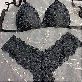 ✨Bộ Nội Y Thiết Kế Ren Cao Cấp Đen Họa Tiết Nét Xanh Có Mút Quần Đùi