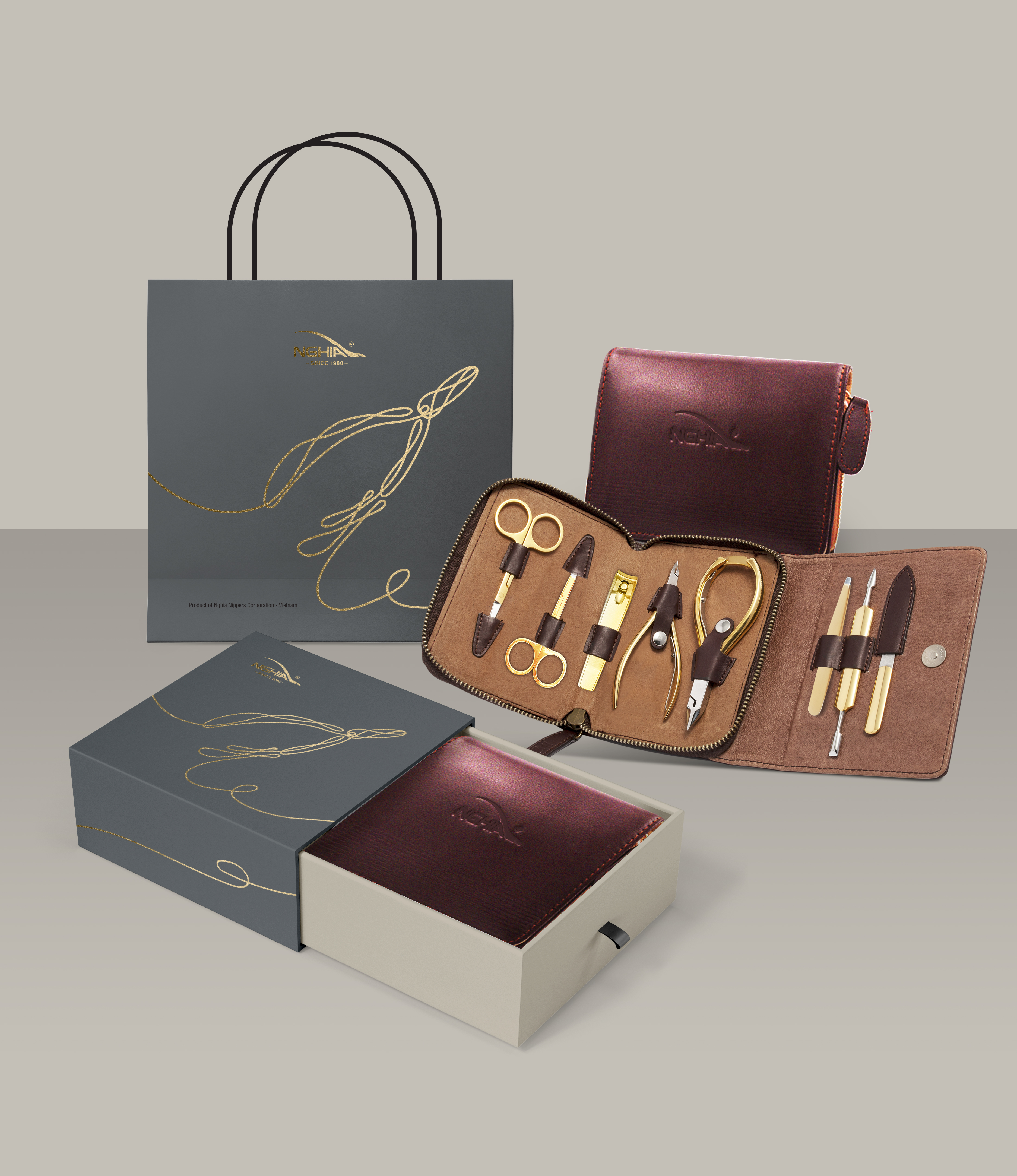 Mua tại TiktokVới hơn 40 năm kinh nghiệm trong lĩnh vực sản xuất kềm cắt da và kềm cắt móng, đội ngũ chuyên gia và các kỹ thuật viên lành nghề của chúng tôi đã và đang tạo ra các sản phẩm kềm cao cấp dưới thương hiệu Nghĩa và những nhãn hiệu khác như OMI, EVO Bộ sản phẩm quà tặng cao cấp GS.01 CC là sự kết hợp sản phẩm của 2 nhãn hiệu OMI và Nghĩa sản xuất theo tiêu chuẩn Nghĩa đảm bảo chất lượng các sản phẩm cắt bén, êm, bền và các sản phẩm được mạ vàng 24K. Các sản phẩm được đặt/đựng trong bóp nhỏ gọn không chỉ giúp bảo quản sản phẩm mà còn có thể luôn mang theo bên mình khi đi làm, đi du lịch. Bộ sản phẩm quà tặng cao cấp GS.01 CC thích hợp làm quà tặng cho đối tác kinh doanh VIP, khách hàng VIP. Thiết kếBộ sản phẩm bao gồm: