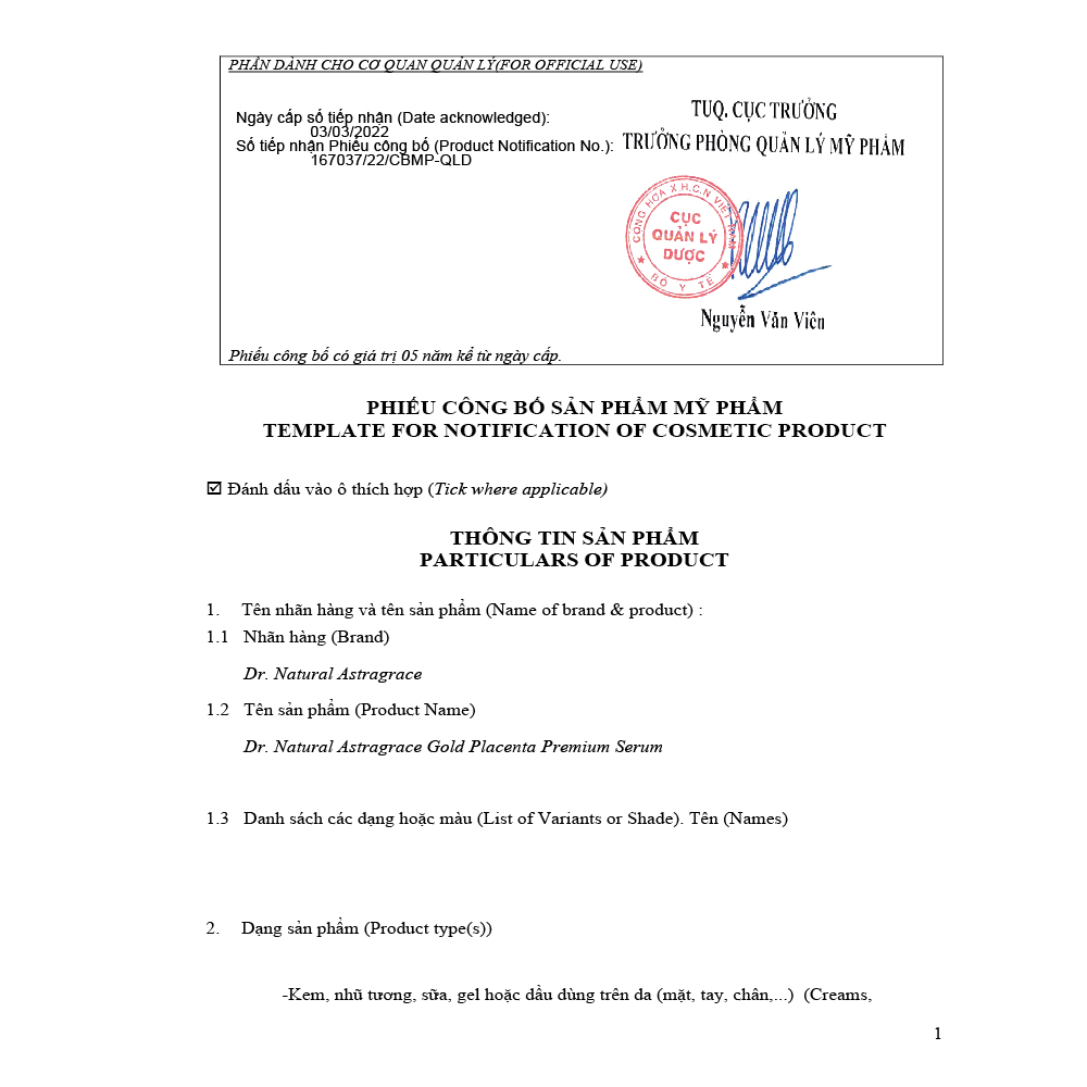 SERUM VÀNG DR. NATURAL ASTRAGRACE GOLD PLACENTA PREMIUM 50ML