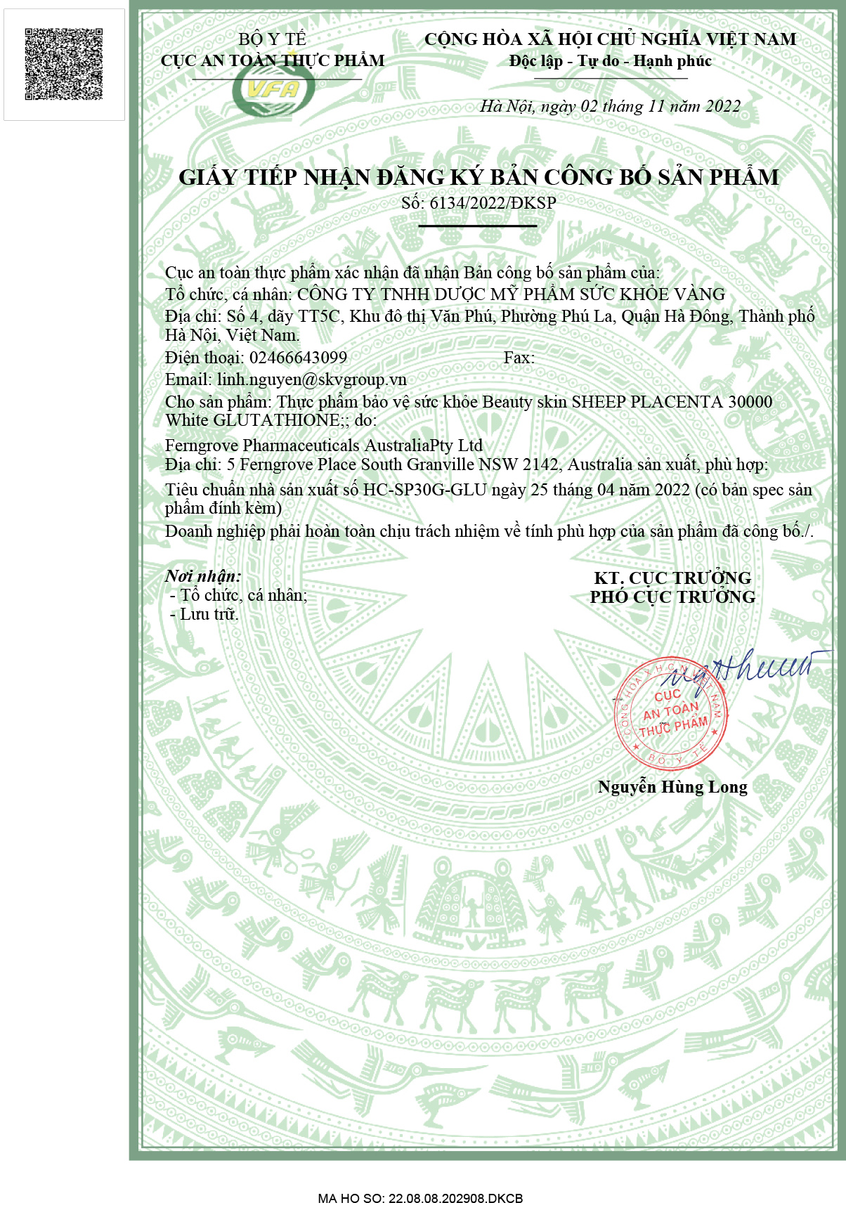 Số công bố lưu hành sản phẩm (Việt Nam): 6134/2022/ĐKSP