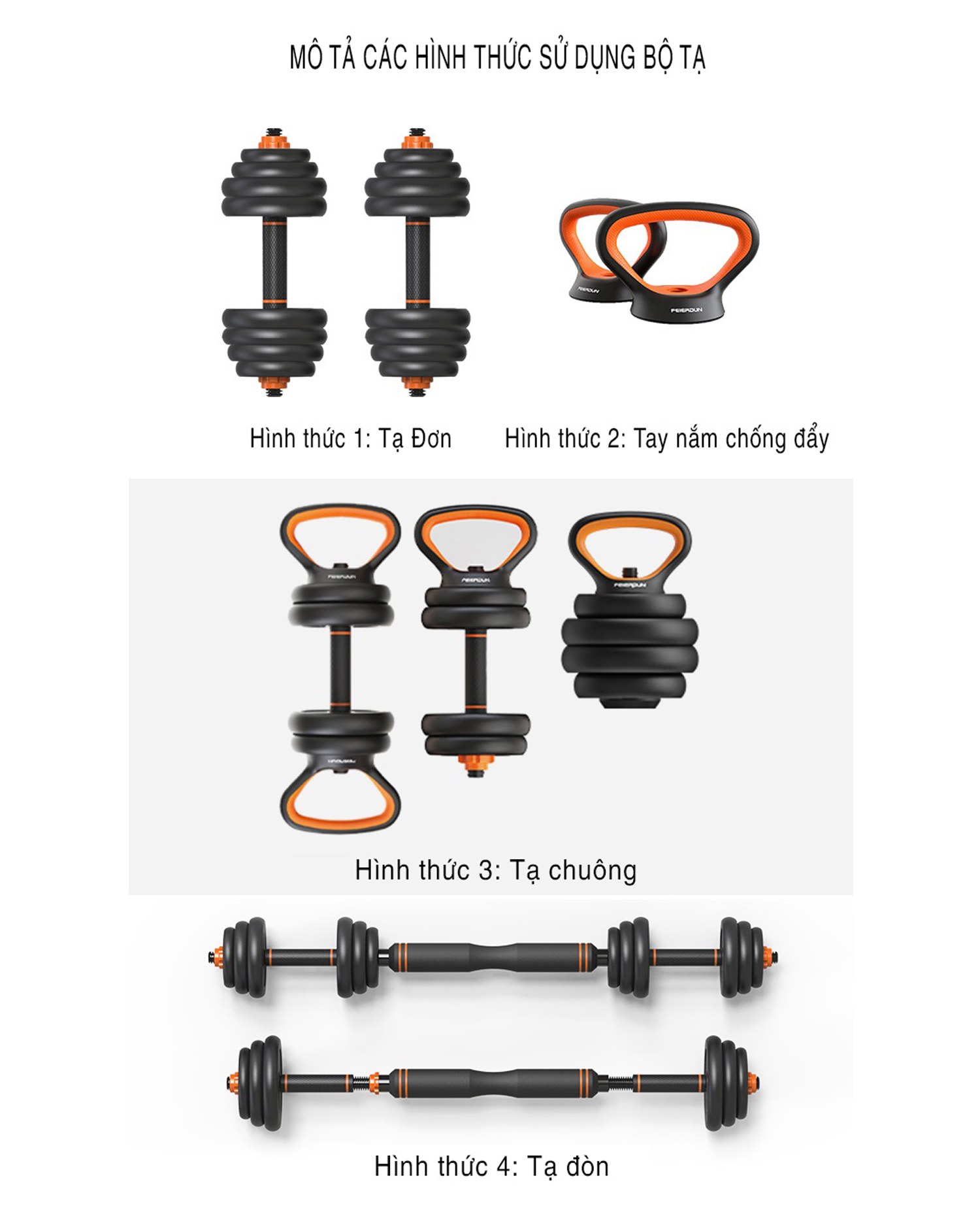 Bộ Tạ 4 in1 là sản phẩm tạ tập luyện, có thể chuyển đổi giữa 3 chế độ: số lượng bánh tạ và kích thước bánh tạ có trên ảnh sản phẩm. Tạ tay, Tạ