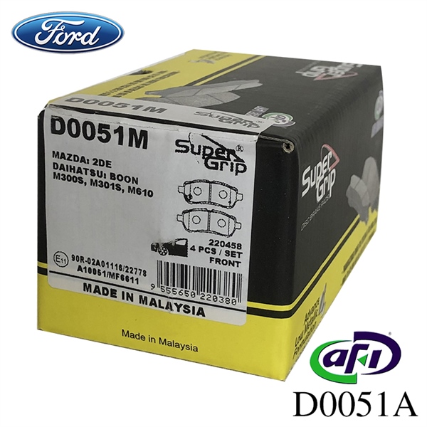 Má phanh trước FORD thương hiệu AFI-BRAKE đến từ tập đoàn AFI Brake Manufacturing Sdn. Bhd. Được thành lập vào năm 1997, D0051M - Má phanh đĩa trước lắp cho các dòng xe sau: FORD