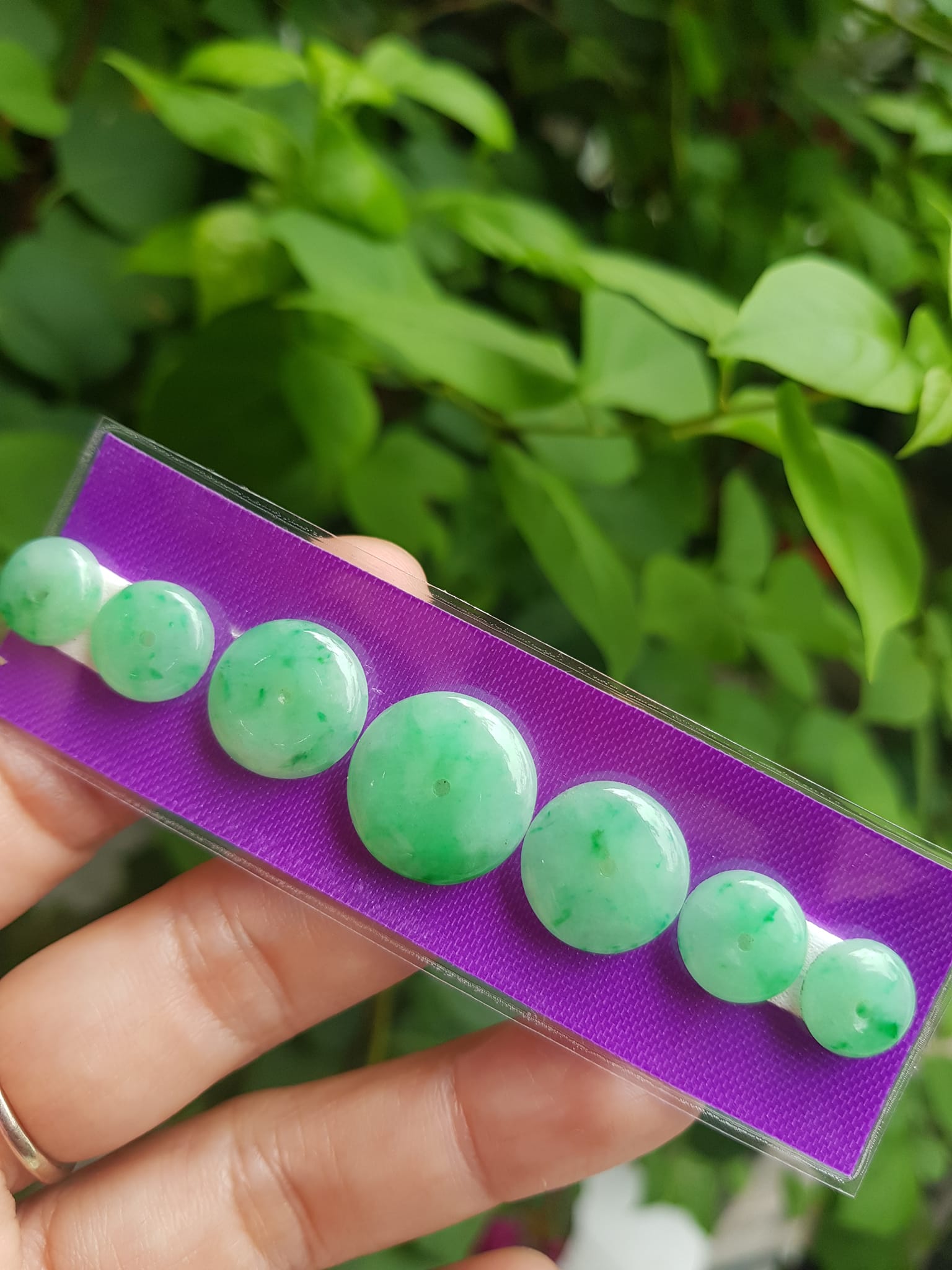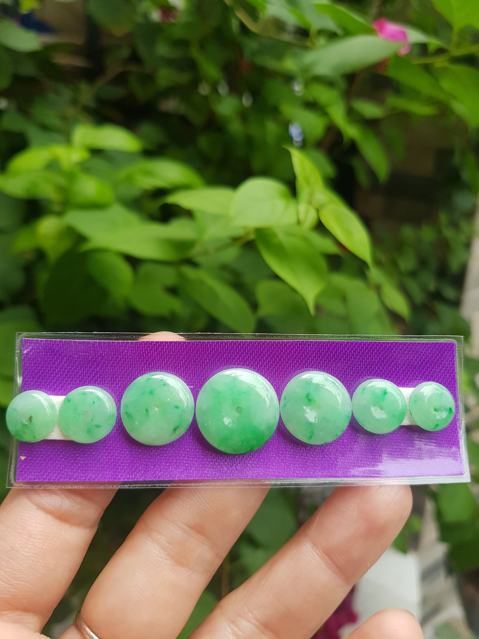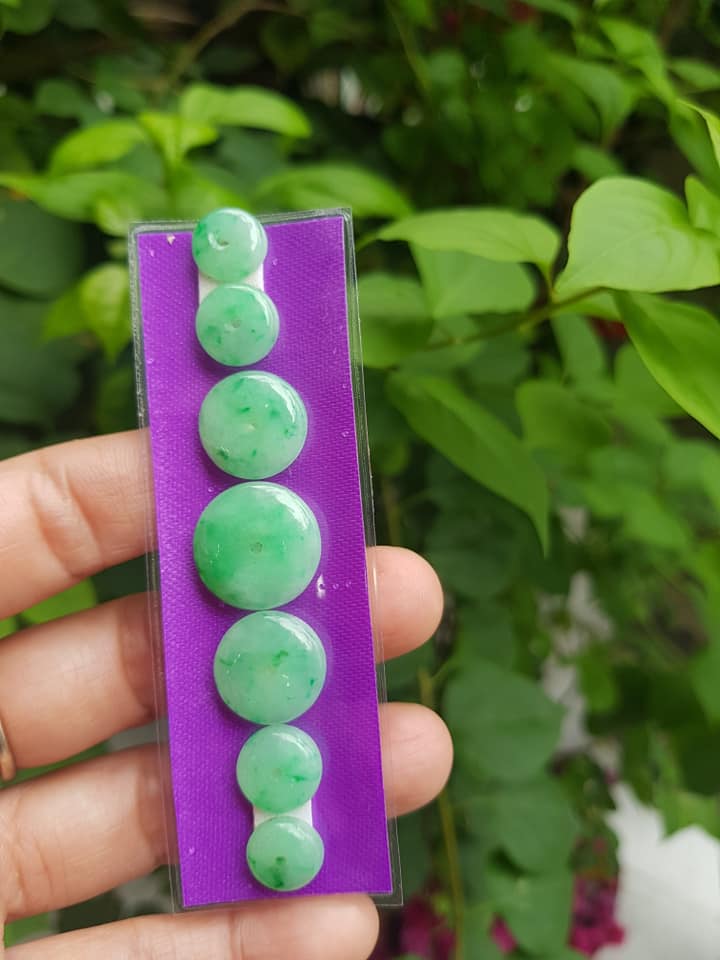 Bộ 5 đồng tiền đá cẩm thạch tự nhiên xanh ngọc đậm đều đẹp Nữ Phối vòng tay,mặt dây chuyền vàng đeo cực kỳ xinh xắn ạ Size hạt 9mm x dầy 3,8mm x lỗ