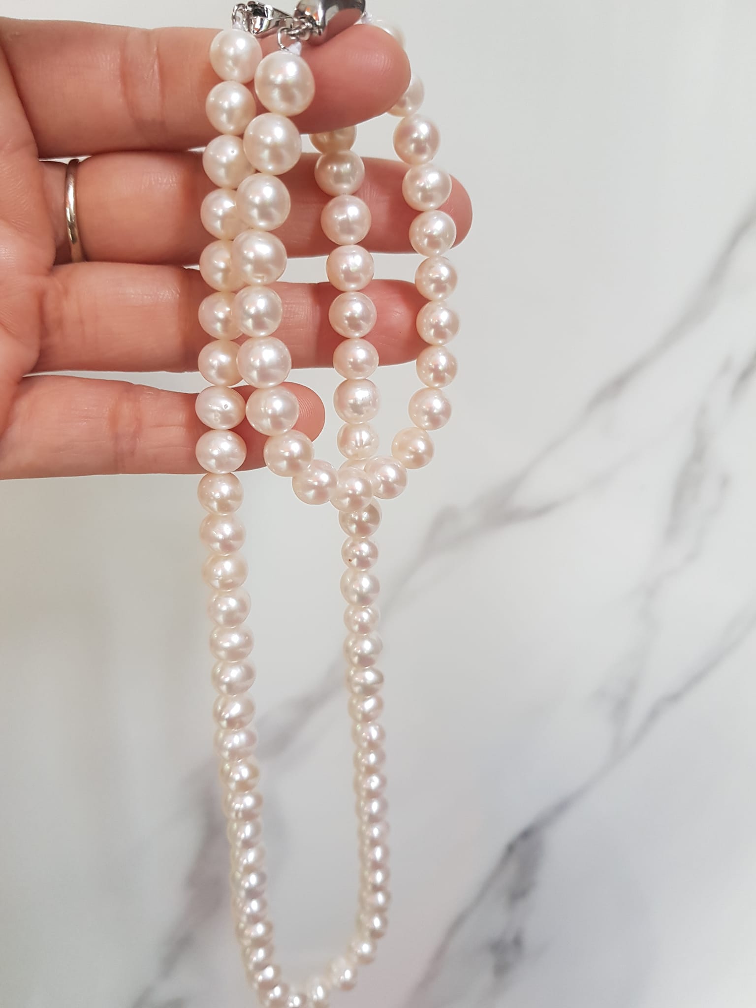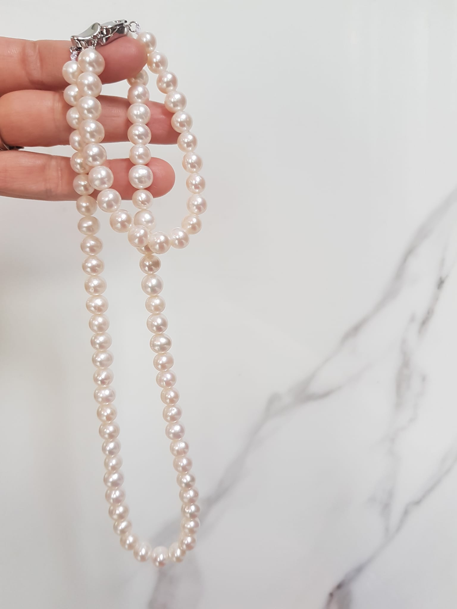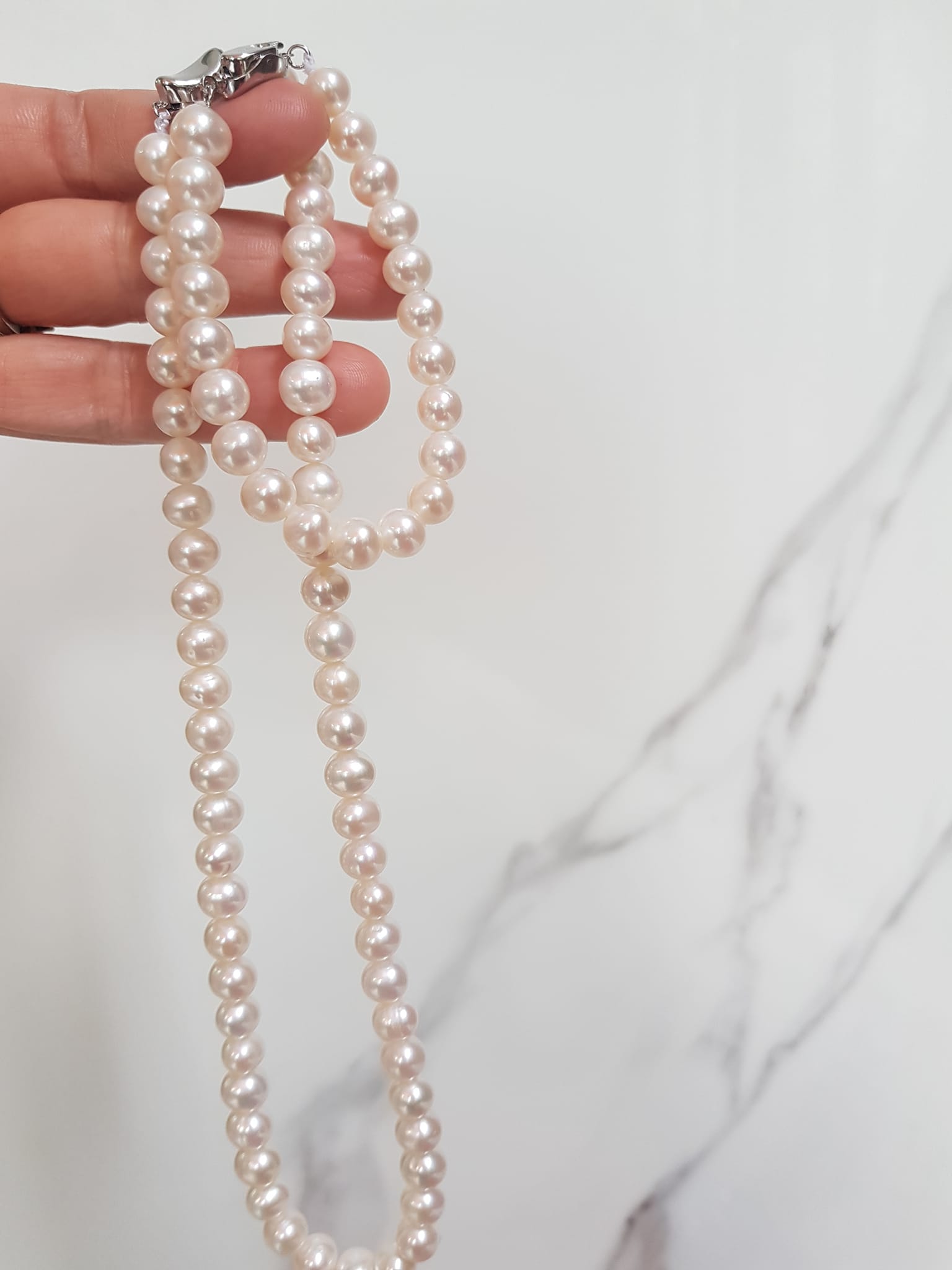 NGỌC TRAI TRẮNG 5A- BNTT001A * THÔNG TIN SẢN PHẨM: BỘ VÒNG CỔ- TAY NGỌC TRAI TRẮNG - Chất liệu: Ngọc trai nuôi tự nhiên nước ngọt - Chiều dài: 43- 48cm - Kích thước: