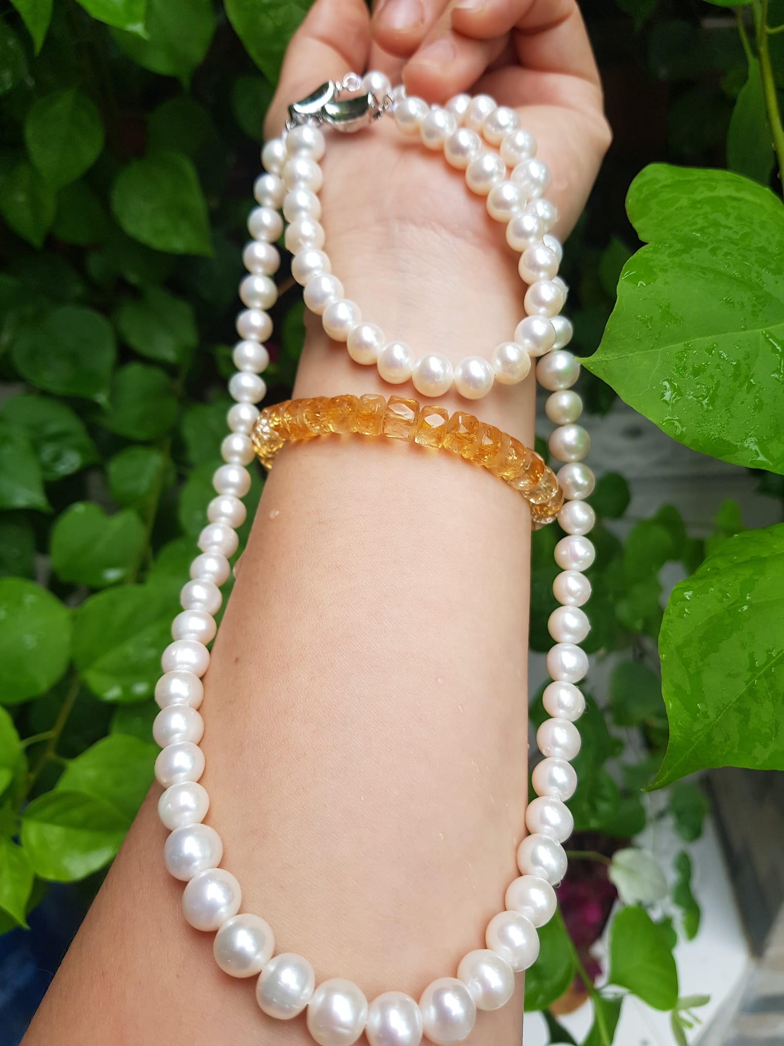 Bộ Vòng Tay Dây Đeo Cổ Ngọc Trai Bóng Đẹp màu Cam Hồng & Trắng size 8mm #ngoctrai #godaptsunnyquận 8