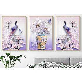 ✨Bộ tranh 3 Bức Dài- Tranh treo phòng khách- Tranh treo tường Chim Công C60153 /Gỗ MDF cao cấp phủ kim sa/ Chống ẩm mốc, mối mọt/Bo viền góc tròn