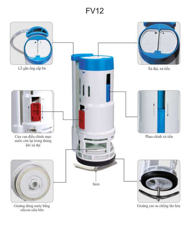 - Dễ dàng điều chỉnh chiều cao mực nước cấp mà không cần đưa tay vao két nước ta chỉ cần nắm xoay đầu cấp ngược chiều kim đồng hồ để mở rồi kéo lên hoặc xuống điều chỉnh mực nước ,các giăng cao su chống lão hóa giúp tăng độ bền