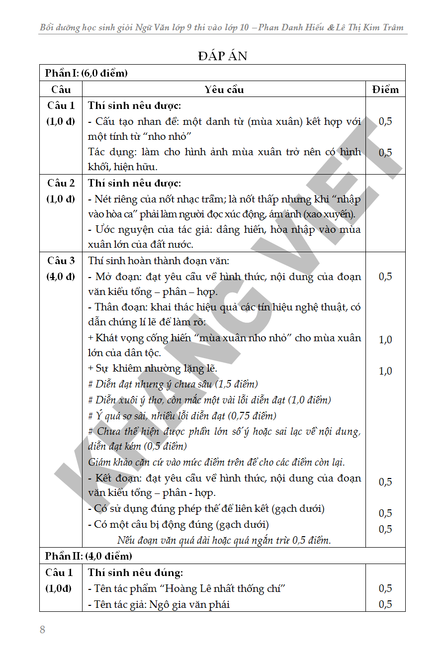 Hiện nay việc thi đầu vào THPT cũng quan trọng như một kỳ thi ĐH. Và môn Ngữ Văn là một trong những môn quan trọng nhất cho việc thi tuyển vào lớp 10 THPT cả những trường chuyên lớp chọn. Hình thức ra đề thi cũng ngày càng đổi mới cho phù hợp với cách dạy và cách học của giáo viên và học sinh. Nhiều tỉnh thành trong cả nước đã mạnh dạn đổi mới thi cử về môn Ngữ Văn theo hướng tư duy cao. Điều đó dẫn đến cách học môn Ngữ văn cũng cần phải có sự thay đổi cho phù hợp. Chính vì vậy, cuốn sách này đã biên soạn một cách khoa học và linh hoạt đáp ứng cho nhu cầu học thi của học sinh THCS ôn thi vào lớp 10 THPT.