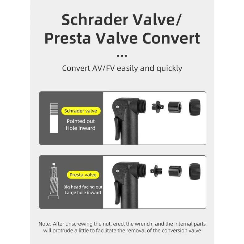 - Thân bơm hợp kim nhôm trọng lượng nhẹ - Tay cầm gấp gọn lại được theo dạng chữ T - Hỗ trợ cả van Schrader (van Mỹ) và Presta (van Pháp) - Cho phép