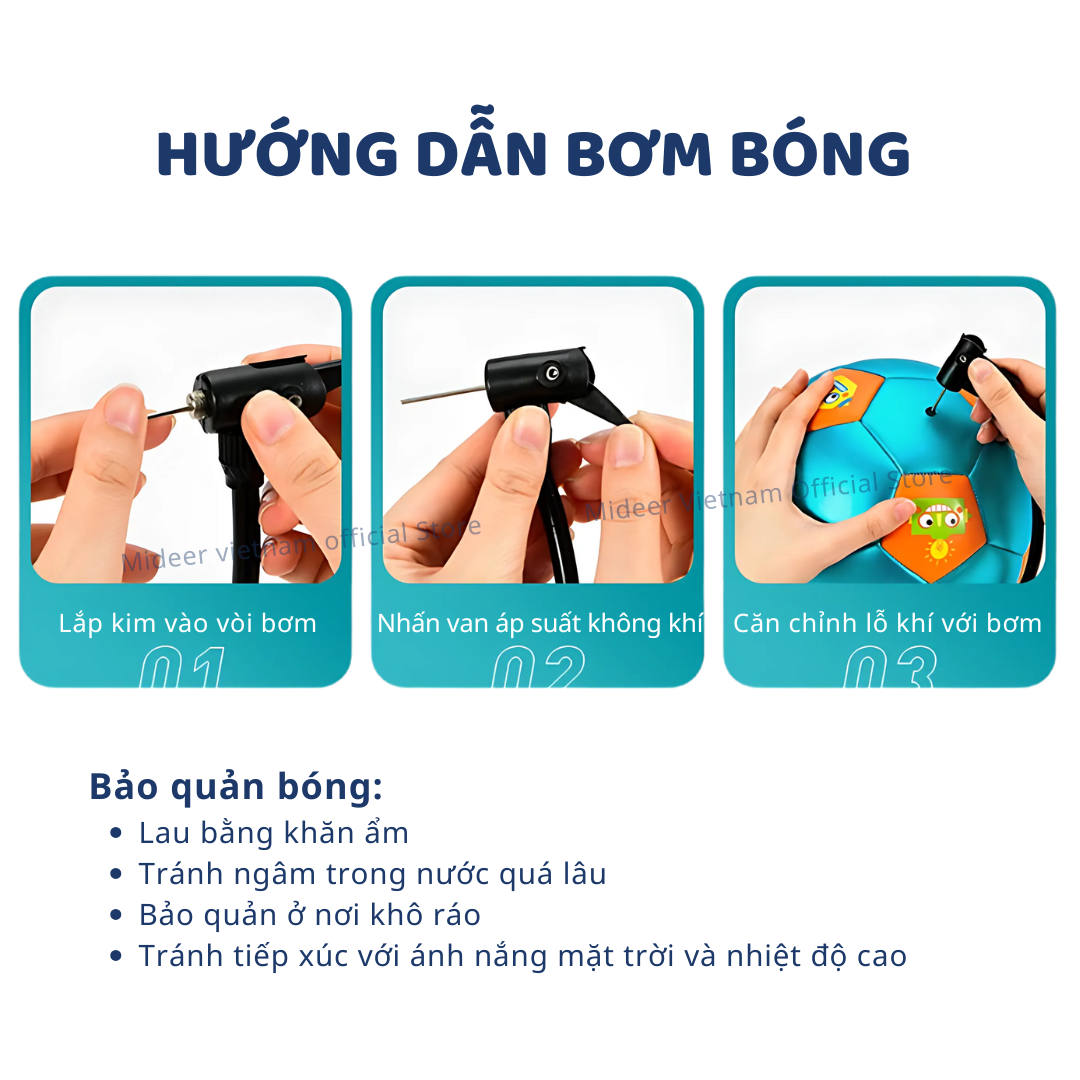 - Chỉ cần làm theo các bước sau: Bước 1: Lắp kim vào vòi bơm. Bước 2: Nhấn van áp suất không khí. Bước 3: Căn chỉnh lỗ khí với bơm. Bóng Đá Cho Bé Vận Động 2,3,4,5,6,7 tuổi Mideer Kids Soccer
