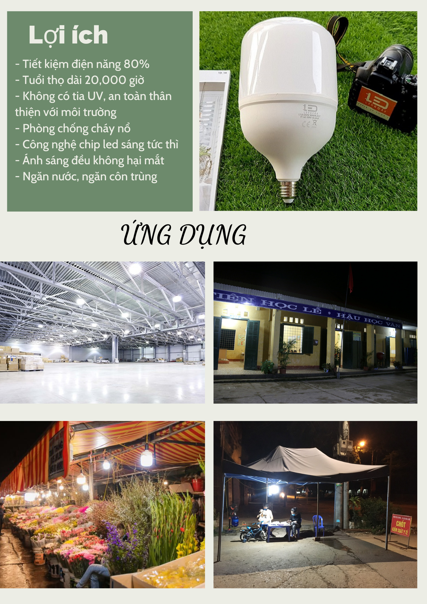 5, Hướng dẫn sử dụng: sử dụng với đui đèn chuẩn E27 dạng xoắn, nên lắp đèn trong điều kiện khô ráo, nếu cần lắp ngoài trời cần có mái che cho đèn để đảm bảo độ bền và tuổi thọ.