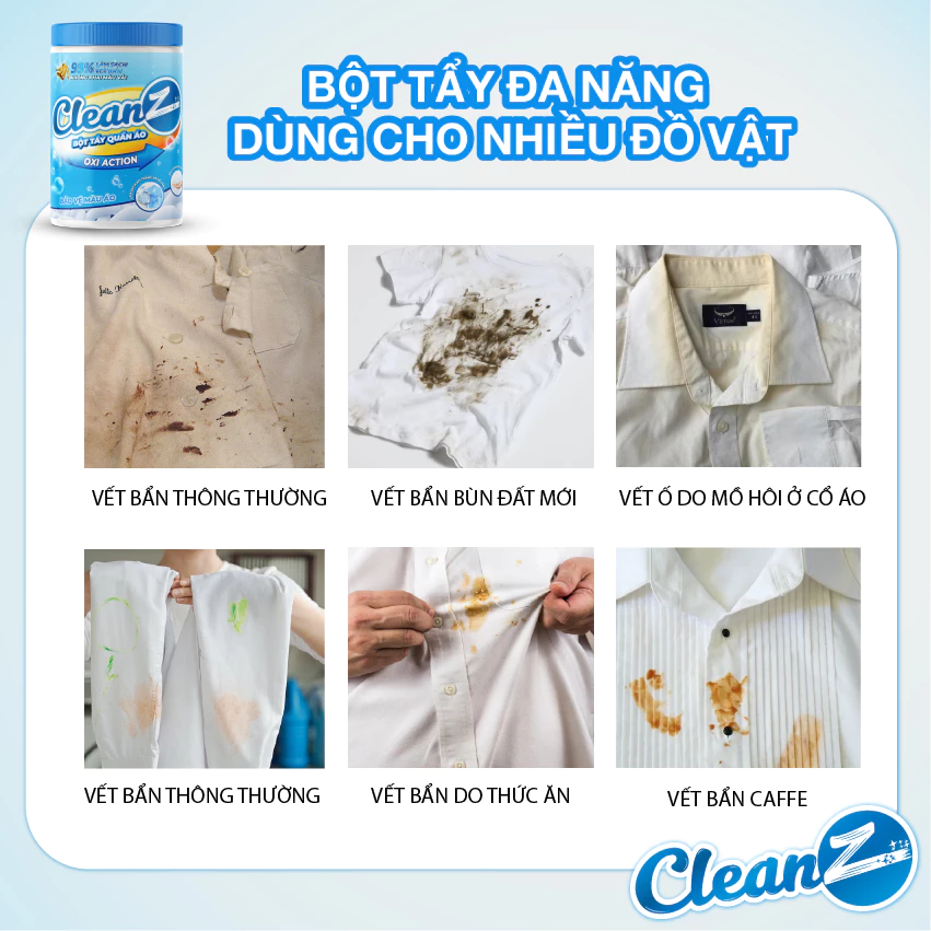 Mua tại TiktokCó quá nhiều vết bẩn khác nhau trong sinh hoạt hàng ngày đặc biệt quần áo và đồ dùng của bạn, sẽ rất tốn rất nhiều chi phí để xử lý cho từng loại vết bẩn nhưng không hiệu quả và gây mùi không tốt cho sức khỏe, nắm bắt được điều đó, CleanZ ra mắt bột tẩy quần áo màu CleanZ