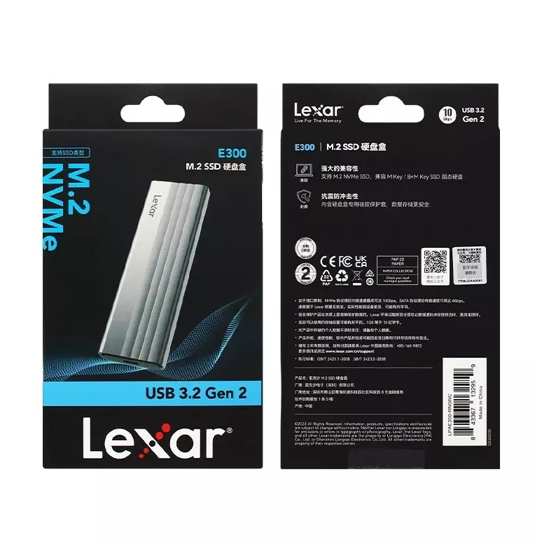 ✨Box ổ cứng Lexar E300 M.2 SSD Enclosure hỗ trợ NVMe SSD 2280/2260/2242/2230, USB 3.2 Gen 2 - Hàng chính hãng