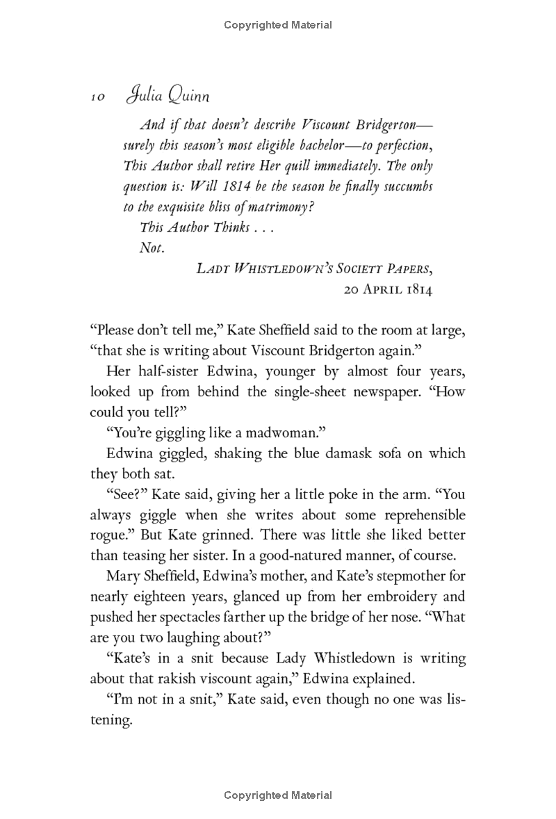 This time the gossip columnists have it wrong. London’s most elusive bachelor Anthony Bridgerton hasn’t just decided to marry—he’s even chosen a wife! The only obstacle is his intended’s older sister, Kate Sheffield—the most meddlesome woman ever to grace a London ballroom. The spirited schemer is driving Anthony mad with her determination to stop the betrothal, but when he closes his eyes at night, Kate’s the woman haunting his increasingly erotic