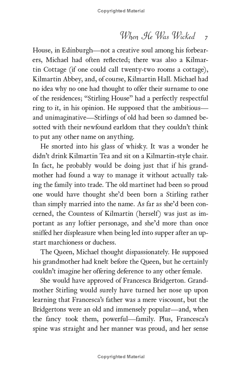 In every life there is a turning point. A moment so tremendous, so sharp and breathtaking, that one knows one’s life will never be the same. For Michael Stirling, London’s most infamous rake, that moment came the first time he laid eyes on Francesca Bridgerton.