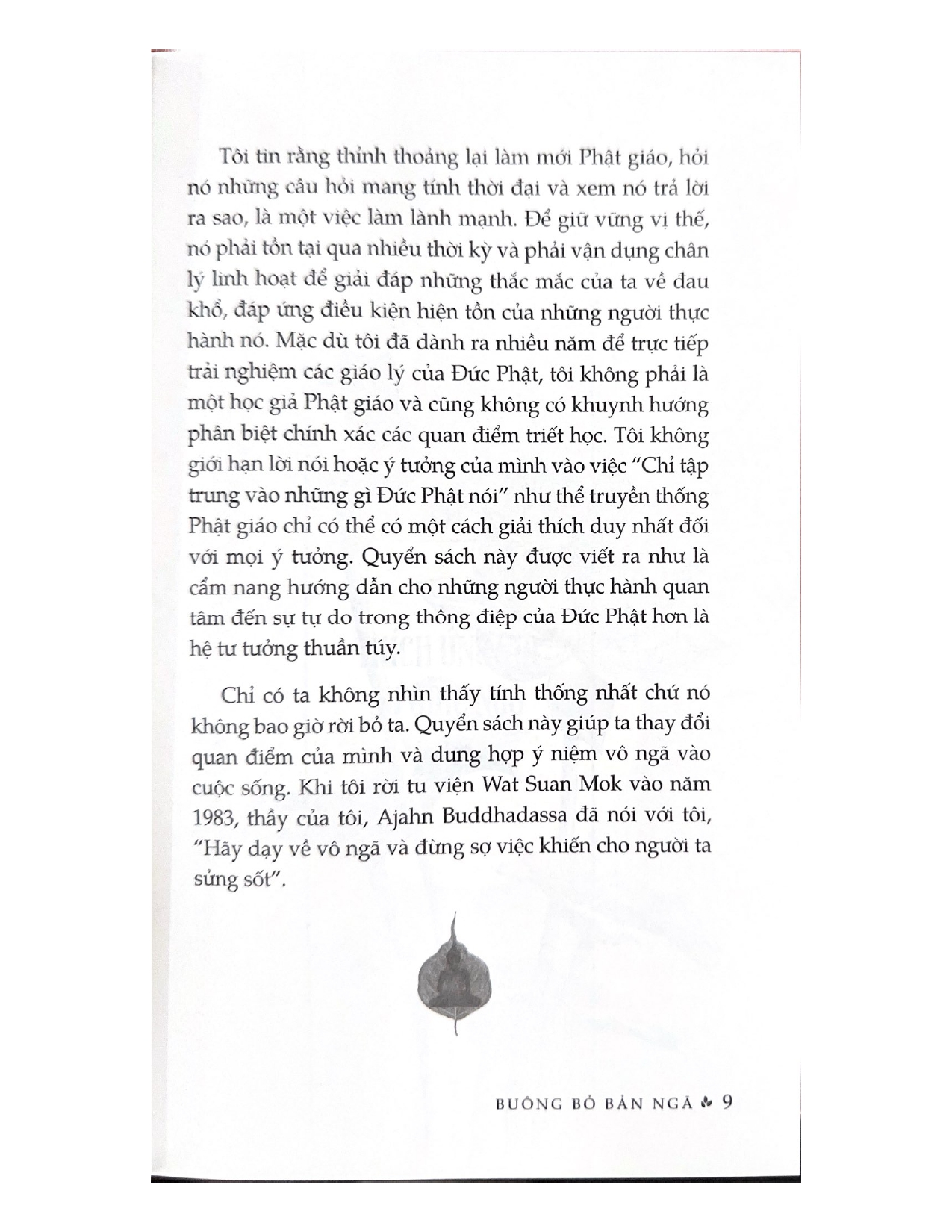 “Quyển sách này được viết ra như là cẩm nang cho những người thực hành quan tâm đến sự tự do trong thông điệp của đức Phật hơn là tư tưởng thuần túy. Chỉ có ta không nhìn thấy tính thống nhất chứ nó không bao giờ rời bỏ ta.”
