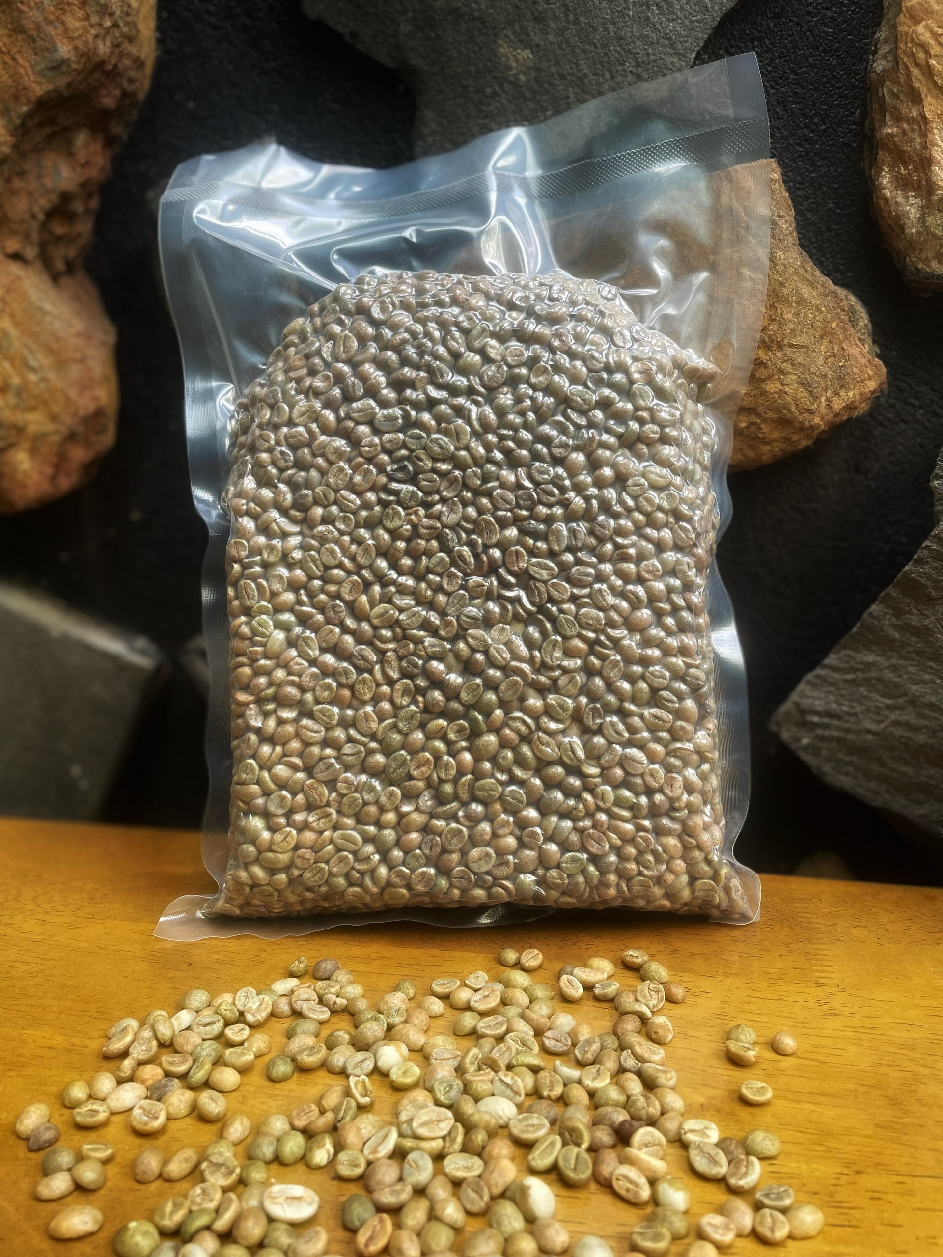Cà phê nhân xanh Arabica Moka chưa qua chế biến. Moka của baka sử dụng nguyên liệu từ những vườn cà phê thuần arabica ít ỏi còn sót lại bên sườn núi Ngọc Linh, vùng