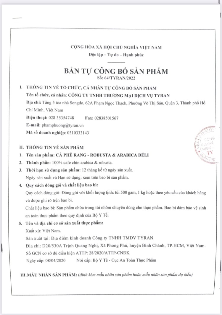 Thành phần / Ingredients: 100% Robusta. Hương vị / Flavor: Đắng đậm, sôcôla, mùi thuốc lá và hậu vị ngọt / Bold, chocolate, cigarette flavor and sweet after-taste. úi 500g / Bag 500gQuy cách / Type: