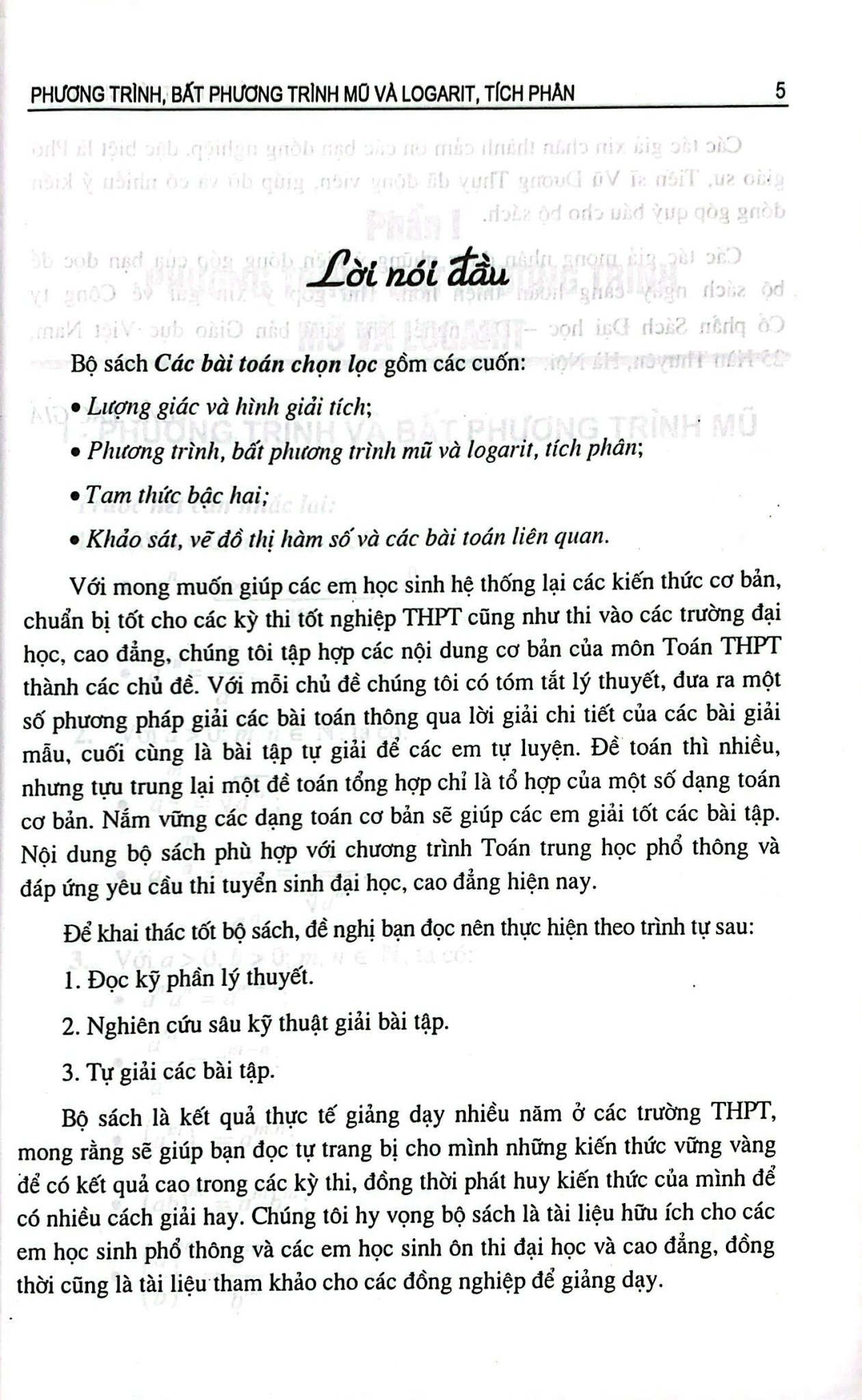 Bộ sách là kết quả thực tế giảng dạy nhiều năm ở các trường THPT, mong rằng sẽ giúp bạn đọc tự trang bị cho mình những kiến thức vững vàng để có kết quả cao trong các kỳ thi, đồng thời phát huy kiến thức của mình để có nhiều cách giải hay. Chúng tôi hy vọng bộ sách là tài liệu hữu ích cho các em học sinh phổ thông và các em học sinh ôn thi đại học và cao đẳng, đồng thời cũng là tài liệu tham khảo cho các đồng nghiệp để giảng dạy.