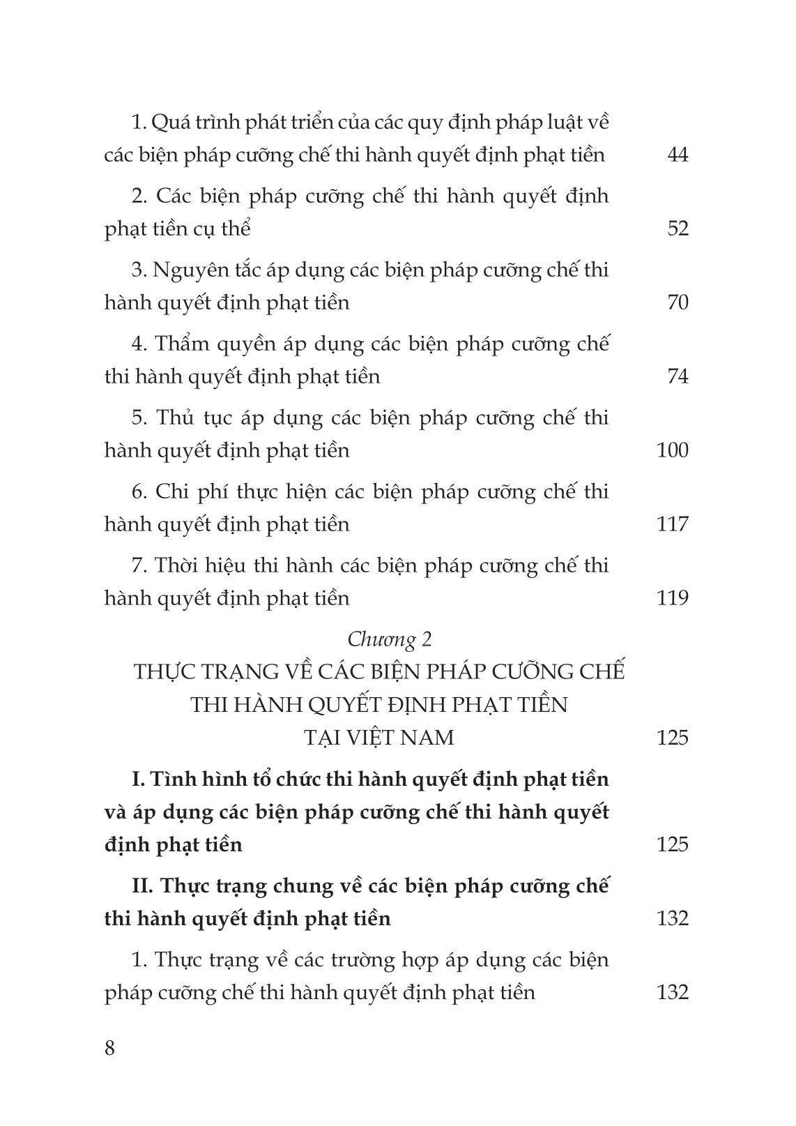 Cuốn sách tập trung phân tích cơ sở lý luận và pháp lý về các biện pháp cưỡng chế thi hành quyết định phạt tiền kết hợp với đánh giá thực trạng pháp luật cũng như thực trạng áp dụng các biện pháp này. Ngoài ra, cuốn sách cũng nêu lên những bất cập của pháp luật khi quy định một số nội dung liên quan (như các trường hợp bị cưỡng chế, thẩm quyền cưỡng chế, xử lý vi phạm liên quan đến việc áp dụng các biện pháp cưỡng chế, sự chồng chéo về số lượng cũng như nguyên tắc áp dụng các biện pháp cưỡng chế và những vấn đề khó khăn, trở ngại trong quá trình áp dụng từng biện pháp cưỡng chế cụ thể), từ đó đề xuất các giải pháp để hoàn thiện pháp luật về các biện pháp cưỡng chế thi hành phạt tiền trong xử phạt vi phạm hành chính.