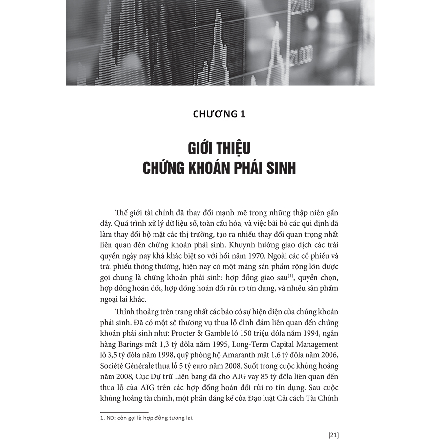 Cuốn sách này giới thiệu về các sản phẩm và các khái niệm cơ bản của chứng khoán phái sinh. Trong chương đầu, chúng tôi giới thiệu một số khái niệm quan trọng và cung cấp bối cảnh để đặt chứng khoán phái sinh vào đó. Khởi đầu, chúng tôi định nghĩa chứng khoán phái sinh là gì. Sau đó, chúng tôi đánh giá ngắn gọn các thị trường tài chính và nhận định các thị trường phái sinh đang ngày càng quan trọng hơn trong những năm gần đây. Quy mô của các thị trường này có thể khiến cho bạn thắc mắc là chính xác thì chúng cung cấp các chức năng nào. Kế đó chúng ta sẽ thảo luận về vai trò của các thị trường tài chính trong cuộc đời mình, và tầm quan trọng của việc chia sẻ rủi ro. Chúng ta cũng thảo luận các quan điểm khác nhau về chứng khoán phái sinh. Cuối cùng, chúng ta sẽ luận bàn về cách thực hiện giao dịch, cung cấp một số khái niệm và ngôn ngữ cơ bản có ích cho các chương sau.