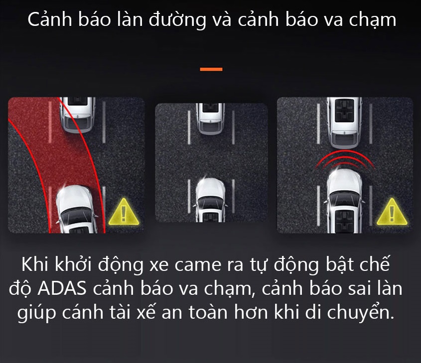 ADAS phát hiện xe phía trước di chuyển, có cảnh báo lấn làn khi di chuyển trên 60km/h và khoảng cách với xe phía trước được cảnh báo bằng giọng nói trên camera.
