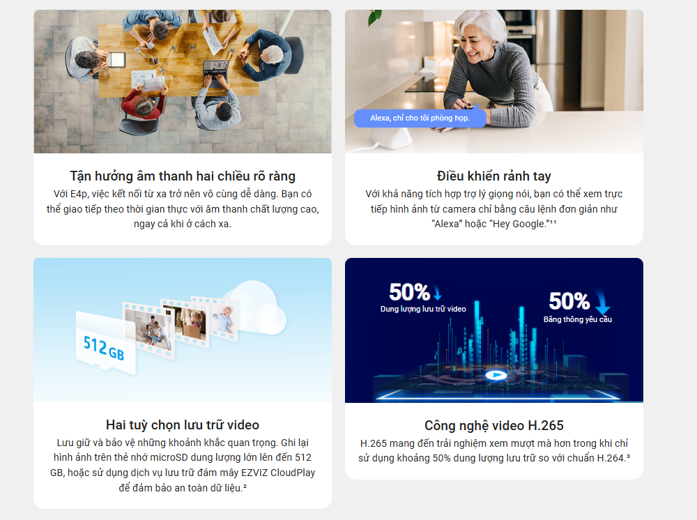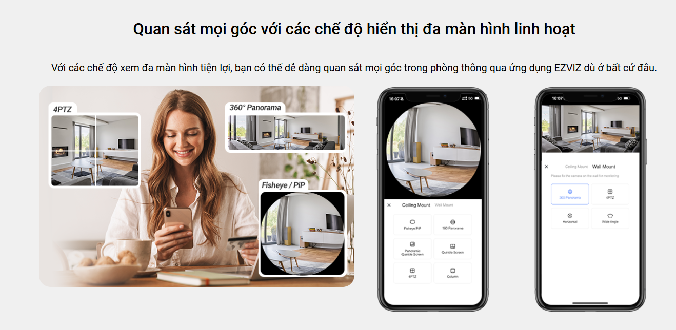 Camera hỗ trợ chế độ xem cận cảnh PiP và chia màn hình đa góc. Bạn có thể chọn chế độ toàn cảnh hoặc tập trung vào khu vực cụ thể. Ứng dụng EZVIZ cho phép điều chỉnh góc nhìn dễ dàng. Tính năng này giúp giám sát linh hoạt, tiện lợi.