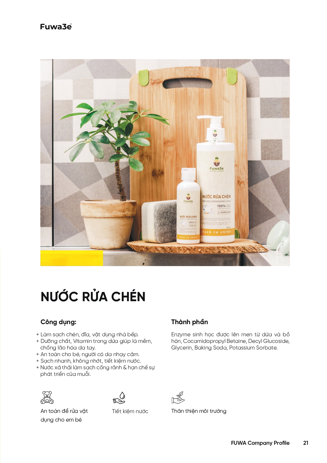 Nước rửa chén Fuwa3e với công nghệ enzyme sinh học lên men từ dứa và bồ hòn, tẩy rửa dầu mỡ hiệu quả và khử mùi tốt nhờ cơ chế xúc tác sinh học. Sản phẩm không chất tẩy hóa học đã được kiểm định không kích ứng da bởi Quatest 2 và chứng nhận khử khuẩn bởi Viện Pasteur. Một đặc điểm nổi bật của sản phẩm là nước thải sau rửa chén có thể dùng trực tiếp để tưới cây, các enzyme trong nước thải sẽ làm sạch đất và cung cấp thêm lợi khuẩn. Sản phẩm Refill 10L là một trong những nỗ lực của Fuwa3e trong việc giảm thiểu nhựa đựng và giúp tiết kiệm chi phí hơn so với mua từng chai nhỏ.
