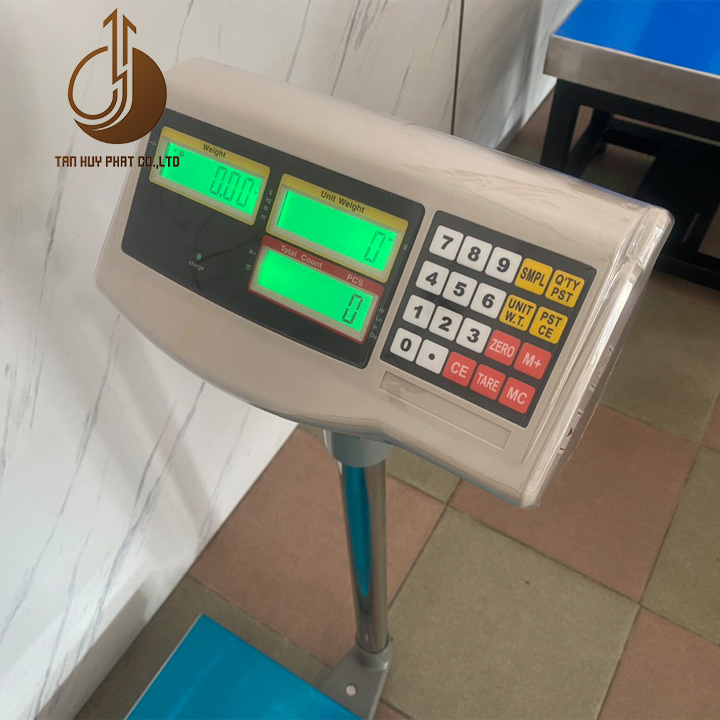 Hiển thị: Màn hình LCD 6 số đen, nền xanh. Hiển thị: Khối lượng, Khối lượng 1 đơn vị mẫu, Số lượng.