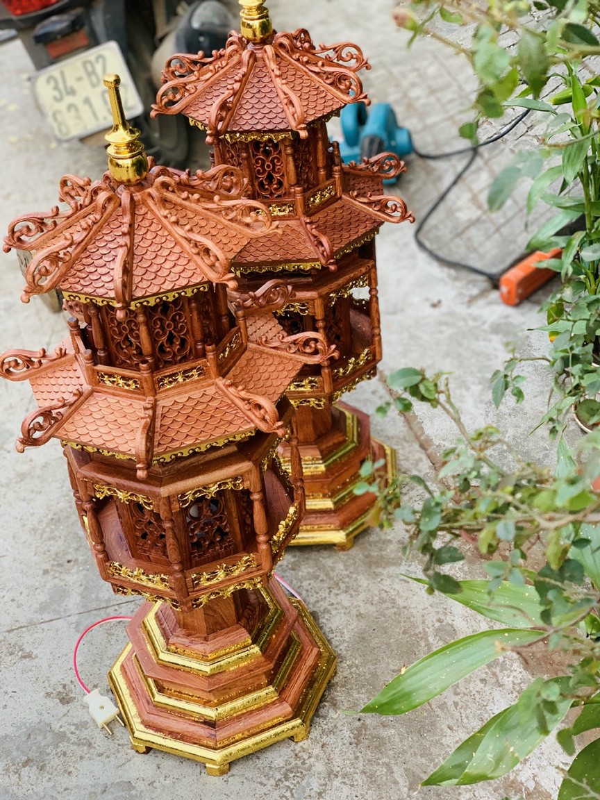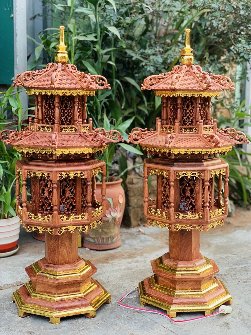 ✨Cặp đèn thờ hình tháp dát vàng điểm cao cấp bằng gỗ hương kt cao 80×33×33cm