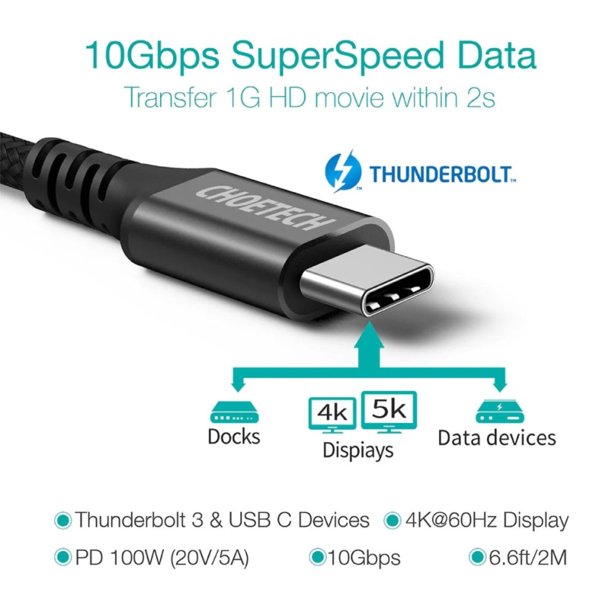 – Choetech XCC-1007 còn hỗ trợ tốc độ truyền dữ liệu lên đến 10 Gbps. Đây là tốc độ truyền dữ liệu rất nhanh, cho phép bạn chuyển dữ liệu lớn và xem phim 4K Ultra HD một cách mượt mà. Thunderbolt 3.1 Gen 2 là một công nghệ giao tiếp tiên tiến được phát triển bởi Intel và hỗ trợ tốc độ truyền dữ liệu gấp đôi so với Thunderbolt 3.0 (20 Gbps) và nhanh hơn rất nhiều so với các tiêu chuẩn truyền dữ liệu USB trước đó. Với tốc độ truyền dữ liệu 10 Gbps, Choetech XCC-1007 cho phép bạn sao chép và di chuyển dữ liệu nhanh chóng giữa các thiết bị có hỗ trợ tương thích. Bạn có thể truyền dữ liệu lớn, như video 4K, tập tin hình ảnh hoặc tệp tin âm thanh, một cách nhanh chóng và hiệu quả. Ngoài ra, công nghệ Thunderbolt 3.1 Gen 2 cũng hỗ trợ các tính năng khác như kết nối màn hình ngoại vi, docking station và các thiết bị lưu trữ cao cấp, giúp mở rộng khả năng kết nối và sử dụng đa năng của cáp sạc.