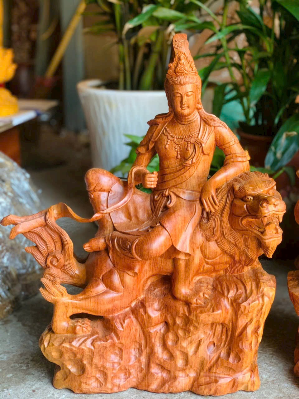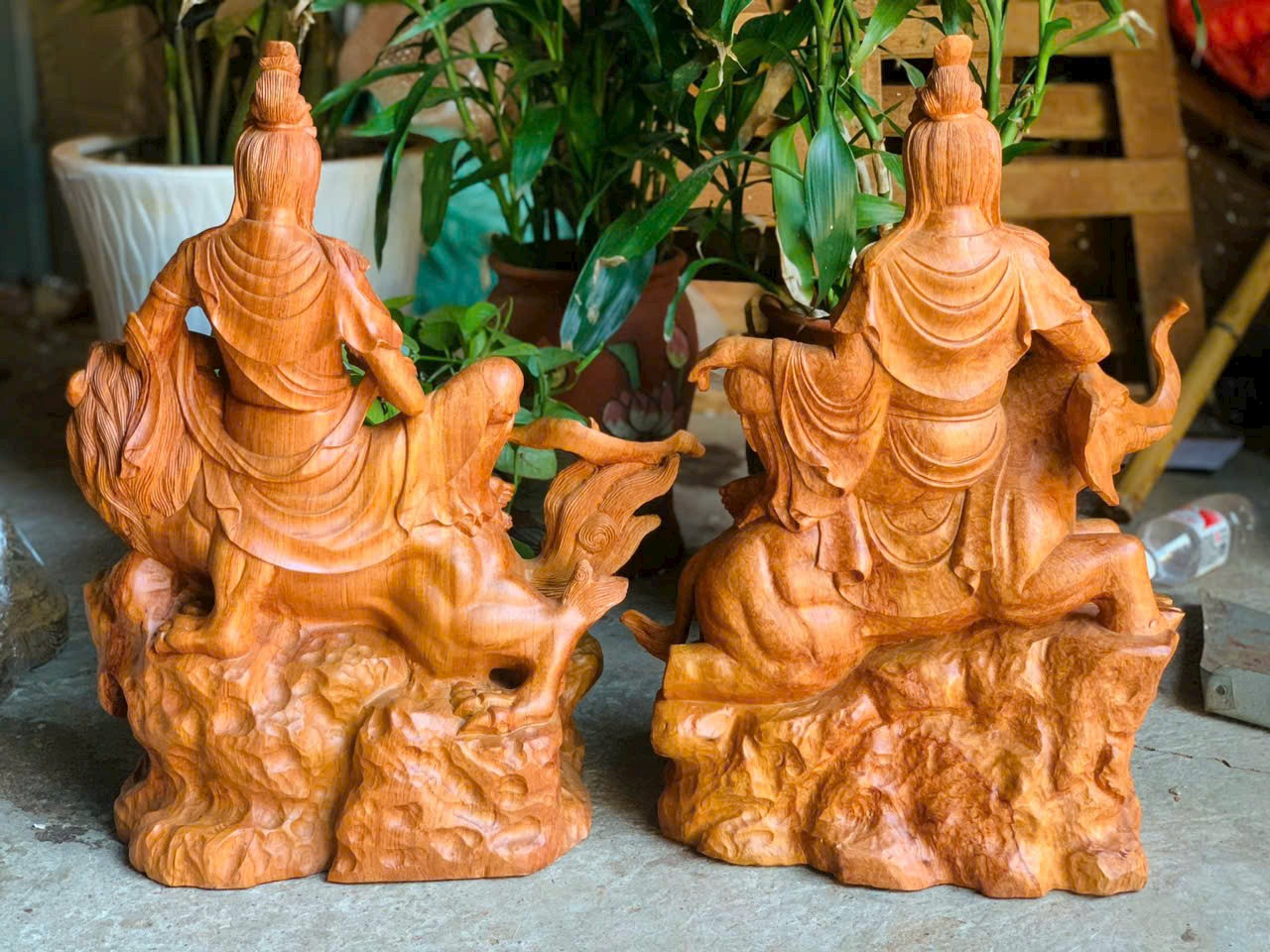 Cặp tượng Văn Thù và Phổ Hiền cưỡi linh thú cao 20 30cm gỗ hương cực đẹp