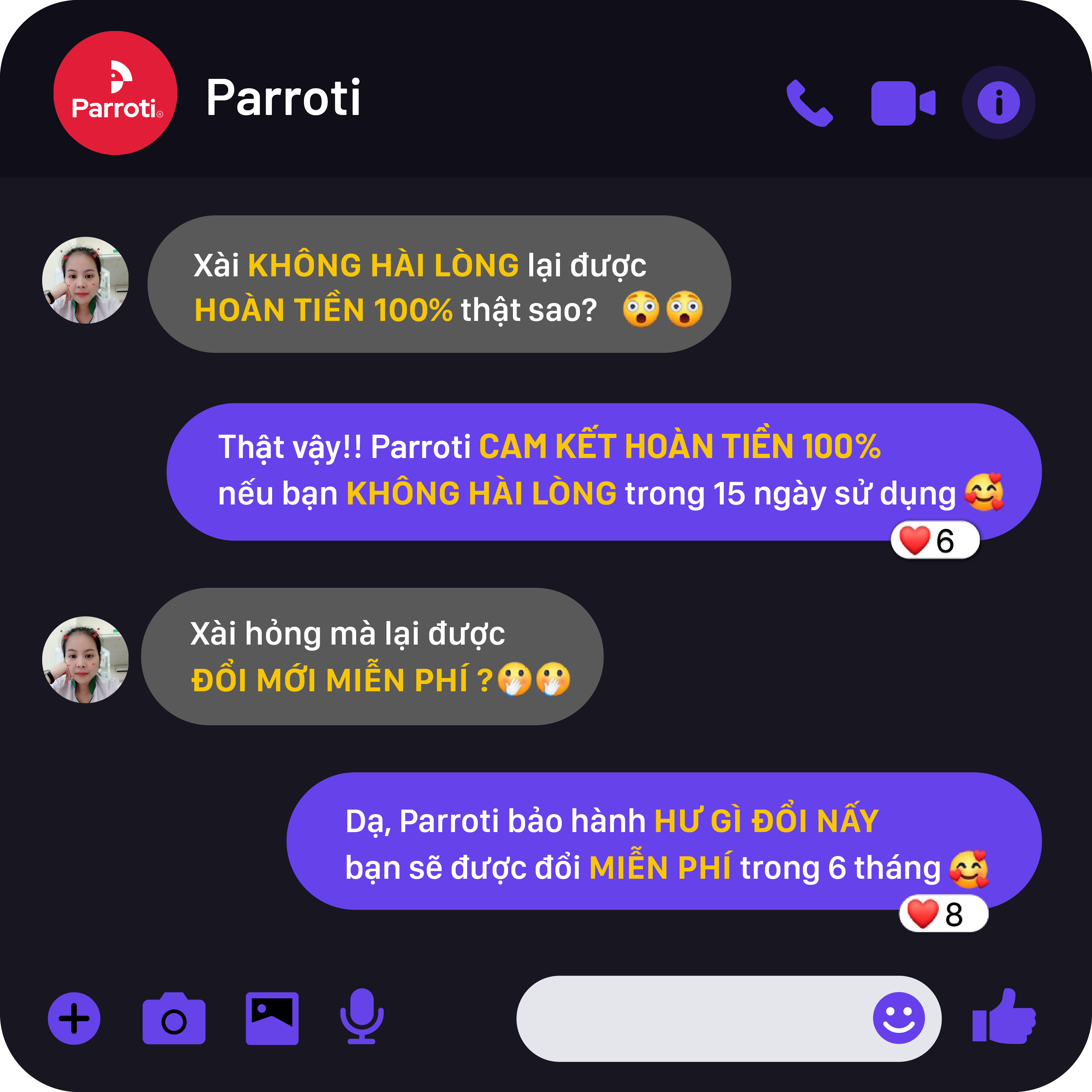 - Chất lượng đảm bảo 100% và đúng như hình ảnh, Parroti sẽ HOÀN TIỀN 500% nếu sản phẩm không giống mô tả.