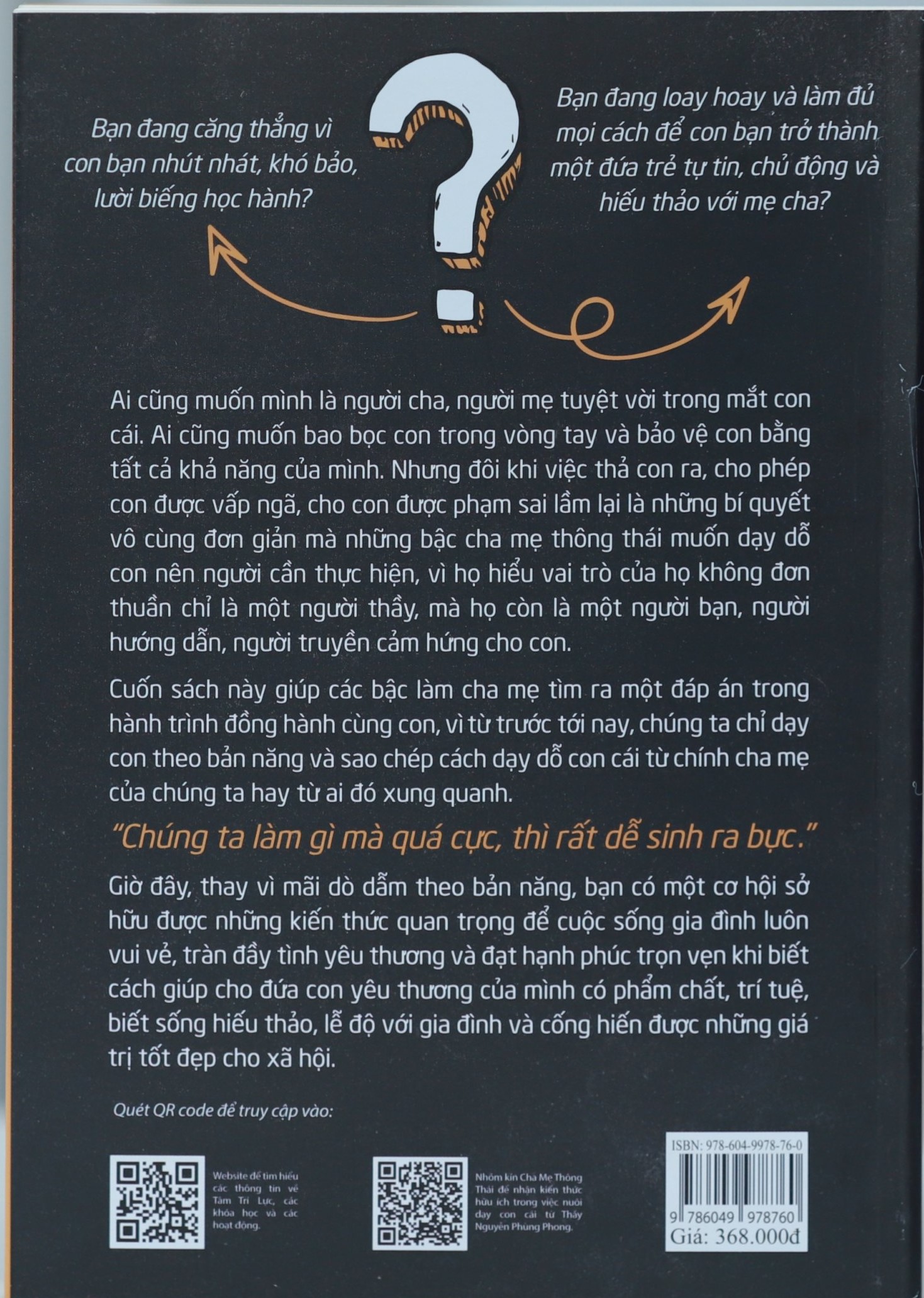 • Chúng ta thường chỉ dạy con theo bản năng hoặc saoc từ chính cha mẹ chúng ta hay từ ai đó xung quanh. Cuốn sách này giúp các bậc làm cha mẹ TÌM RA MỘT ĐÁP ÁN trong hành trình đồng hành cùng con. “Chúng ta làm gì mà QUÁ CỰC, sẽ sinh ra BỰC!”