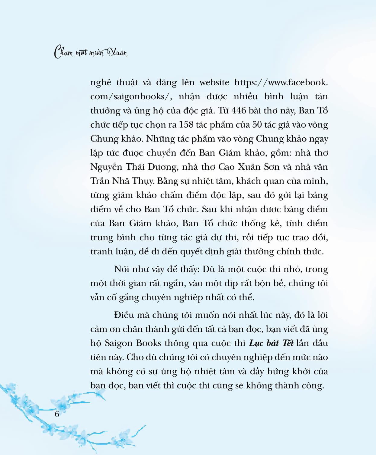 Cuộc thi thơ Lục bát Tết, lần đầu tiên do Saigon Books tổ chức, đặc biệt đáng nhớ vì diễn ra vào những ngày tháng Chạp, giáp Tết Đinh Dậu (2017). Khi những dòng người ngược xuôi, náo nhiệt trở lại quê nhà vui Tết thì Lục bát Tết cũng lần lượt đổ về hộp thư điện tử của chúng tôi. Lục bát, đương nhiên là phải có quy định niêm luật, nhưng vượt lên những niêm luật mang tính kỹ thuật, đó chính là QUY LUẬT TÌNH CẢM, là nhịp điệu thương nhớ gieo mầm, nảy nở theo mùa màng. Chọn 158 tác phẩm của 50 tác giả vào Chung khảo cuộc thi Lục bát Tết để in trong tập sách này, chúng tôi xem đây như là món quà nhỏ gửi đến những bạn đọc, bạn viết yêu thơ. Và, cao hơn là yêu quê hương mình còn lận đận một nắng hai sương, còn trĩu nặng toan lo trên những bờ vai gầy guộc. Chạm một miền Xuân là chạm vào một miền cảm xúc mênh mang của bao người.