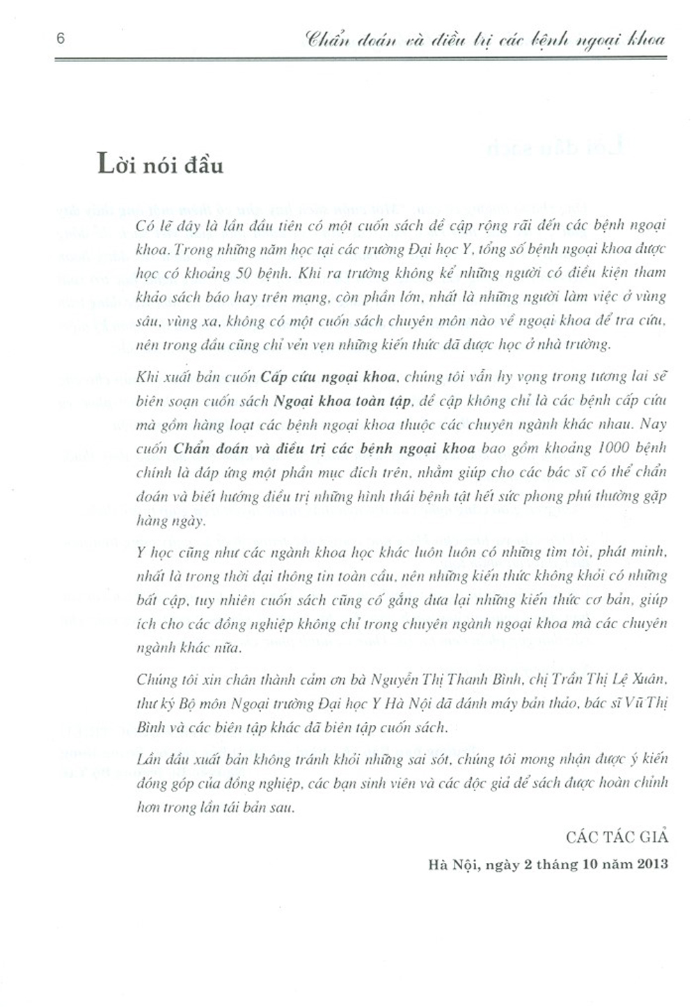 Chẩn đoán và điều trị các bệnh ngoại khoa là cuốn sách đã được Tác giả GS. BS. Đặng Hanh Đệ ( chủ biên),cùng 27 tiến sĩ, thạc sĩ, PGS, BS các khoa Phẫu thuật tạo hình- hàm mặt, Khoa phẫu thuật tiêu hóa, khoa chấn thương chỉnh hình, Khoa gây mê hồi sức, Khoa phẫu thuật gan, Khoa phẫu thuật tiết niệu, Khoa phẫu thuật cấp cứu tiêu hóa, khoa phẫu thuật tim mạch và lồng ngực Bệnh BỆNH VIỆN VIỆT ĐỨC lời giới thiệu, cuốn sách Chẩn đoán và ĐT các bệnh ngoại khoa là cuốn sách đã dược GS. BS Đặng Hanh Đệ cùng các nhà giáo giàu kinh nghiệm của bộ môn ngoại Trường ĐH Y HN biên soạn theo đúng phương châm cung cấp kiến thức cơ bản, hệ thống, nội dung và thuật ngữ chính xác, cập nhật tiến bộ khoa học- kỹ thuật hiện đại của Việt Nam. Chẩn Đoán Và Điều Trị Các Bệnh Ngoại Khoa Cuốn sách với khoảng trên 1.000 bệnh được đề cập chắc chắn sẽ giúp cho các đồng nghiệp, nhất là ở các tuyến cơ sở, vùng sâu vùng xa tăng cường khả năng thực hành nâng tao cay nghê; chuyển giao công nghệ của đội ngũ thầy thuốc tuyến trên giúp tuyến dưới….
