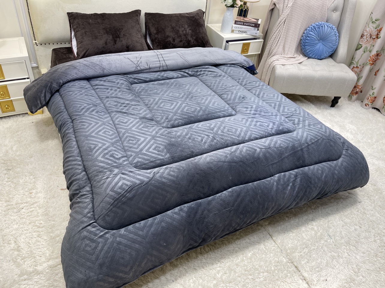 Size Queen 248x233cm chuẩn Âu – rộng rãi, ôm trọn giấc ngủ. • Trọng lượng ~2.2kg – siêu nhẹ, siêu êm, cực ấm. • Bề mặt nhung mịn, dày, không bám lông – chạm vào