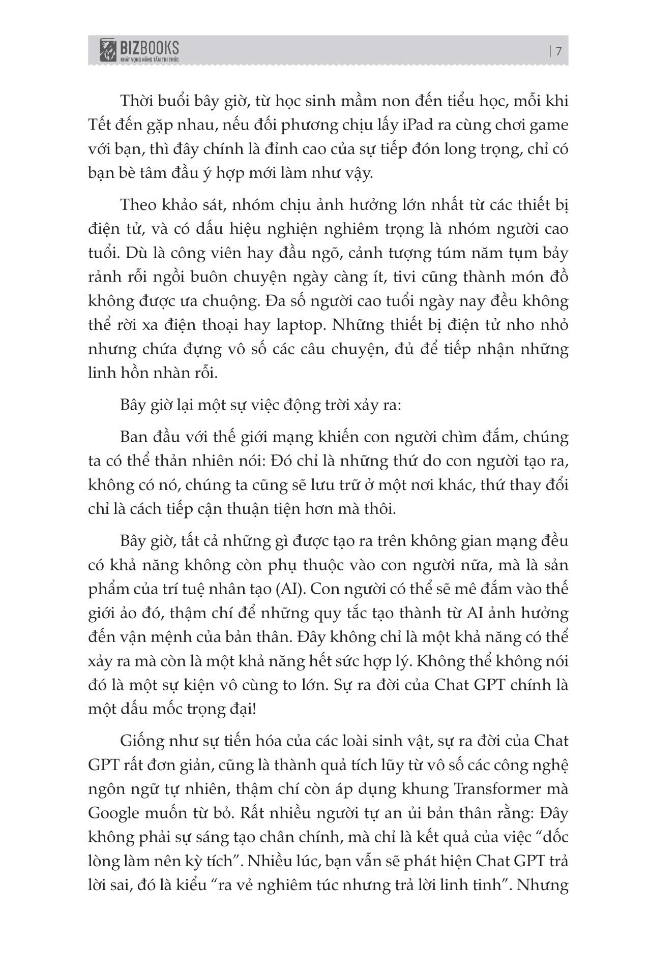 Với sự trợ giúp của Chat GPT, bạn có thể tạo ra những ý tưởng mới và đột phá, phân tích dữ liệu và tạo ra những nội dung cá nhân hóa đầy thu hút. Tương lai của việc sáng tạo nội dung chính là đây, và bây giờ là lúc ta khai thác sức mạnh của AI để luôn dẫn đầu với tư cách là một nhà lãnh đạo tư tưởng. Giống như sự tiến hoá của các loài sinh vật, sự ra đời của Chat GPT rất đơn giản, cũng là thành quả tích lũy từ vô số các công nghệ ngôn ngữ tự nhiên, thậm chí áp dụng khung Transformer mà Google muốn từ bỏ. Điều hiếm hoi, đây là cuốn sách được tạo ra nhanh chóng dưới sự hỗ trợ của ChatGPT